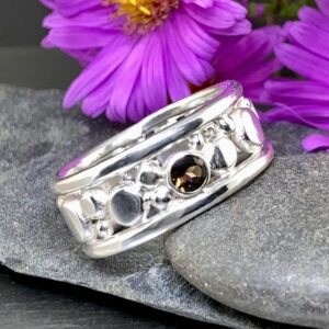 Smoky Quartz Ring – Size 11.25 – Argentium Silver Pebbles Band – 13 Carat