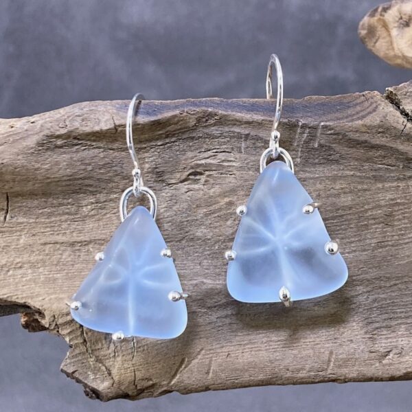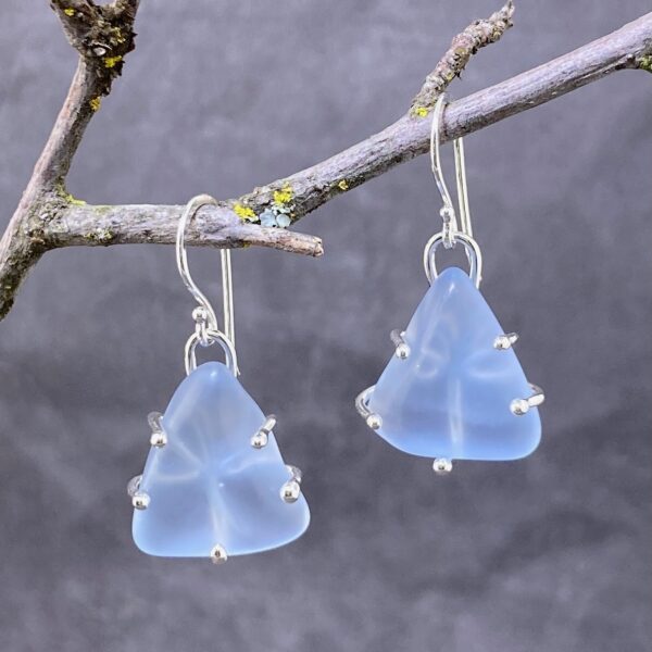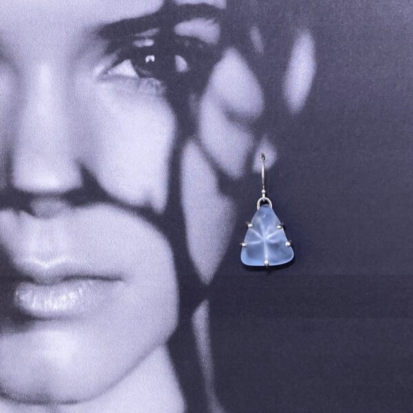 I carefully measure Argentium silver wire to wrap around the each Beach glass piece, then cut it to length. I solder these wires together to form the back. Then lay the Beach glass on the wire shape and half wrap the wire around the glass. Now I can trim the wire to its best length. Using a very soft flame I melt each of the wires ends to a soft ball. Lots of cleaning and polishing and I can set the Glass into it’s wire form, and add the hand made ear wire. Sparkly, lightweight, and beautiful!