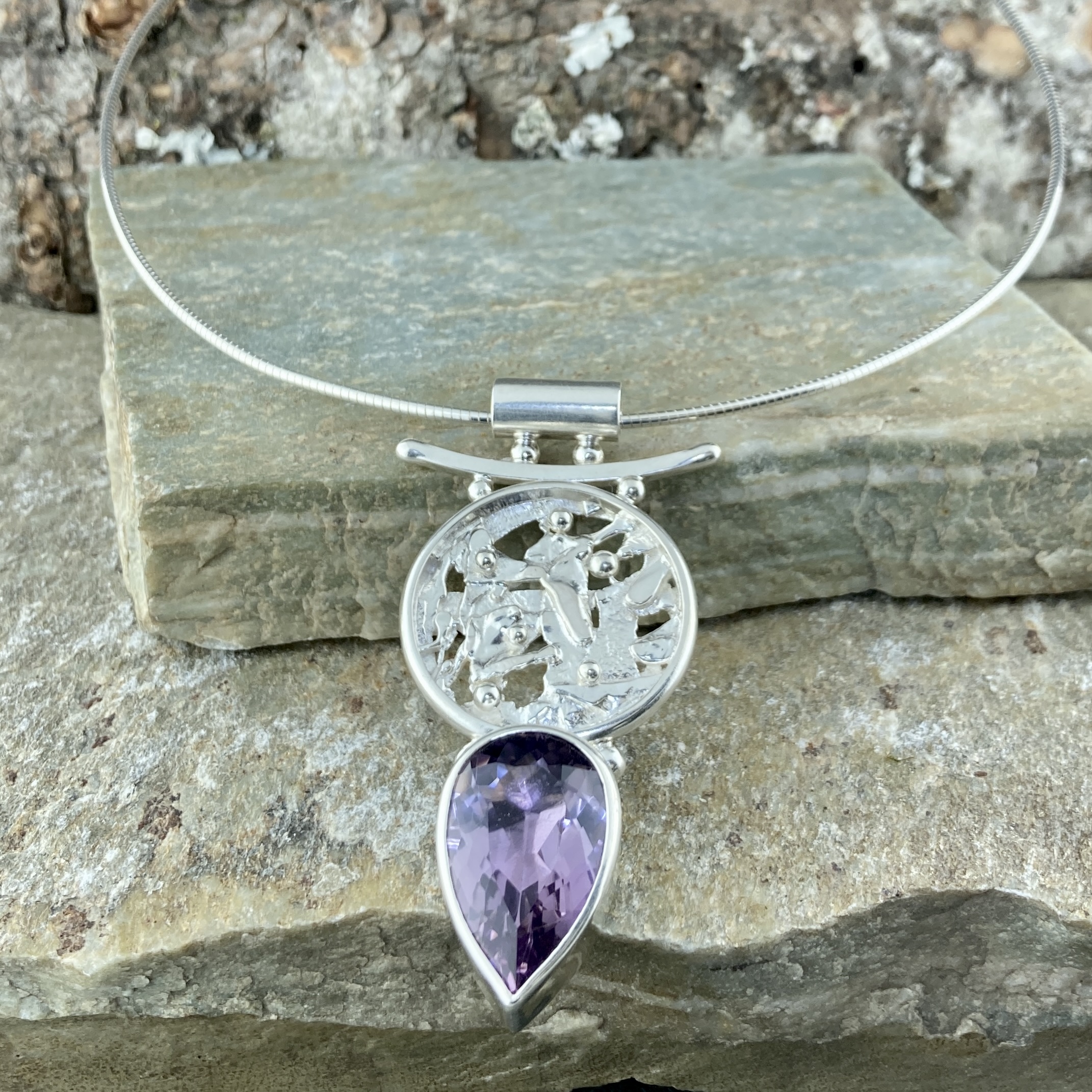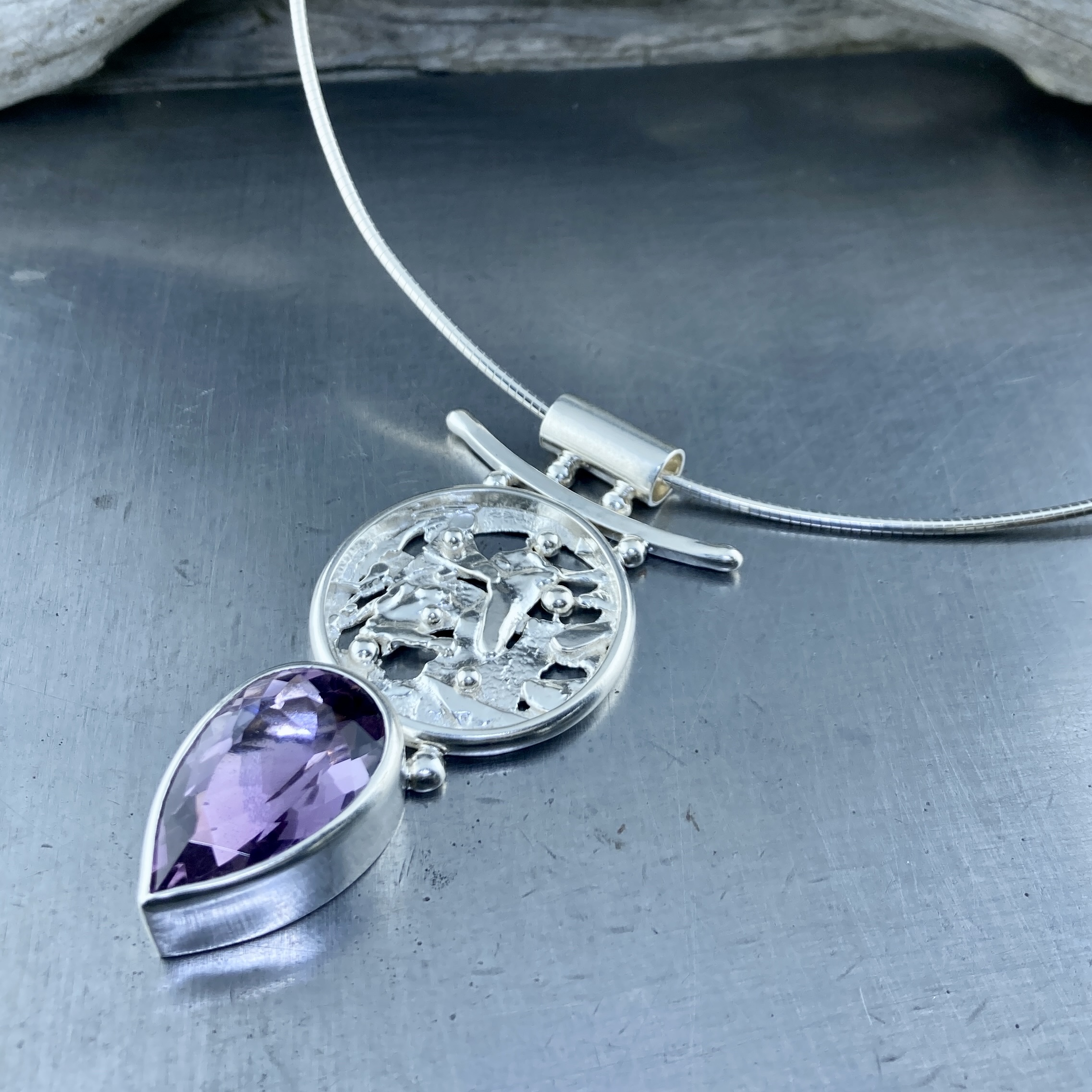 amethyst pendant – Argentium silver rapids circle – 18 carat