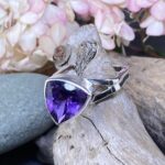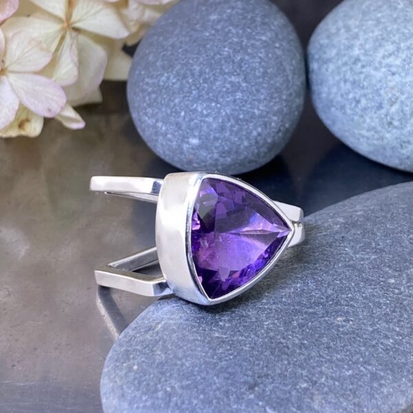 This 8 carat natural Amethyst is trillion-cut, giving it sharp angles and brilliant reflection. Its deep violet tone glows warmly in contrast to the clean silver form. The bezel setting adds both security and a polished edge, keeping the gemstone elevated and bright.