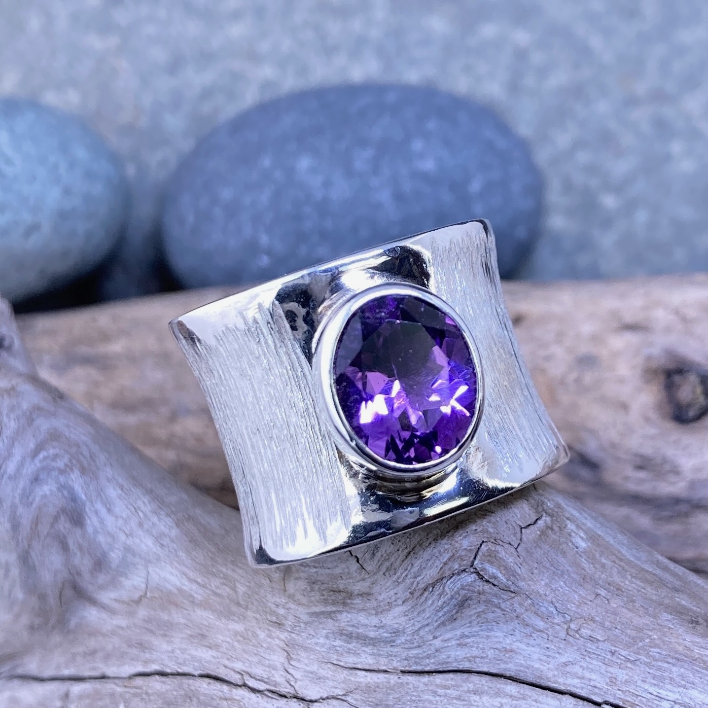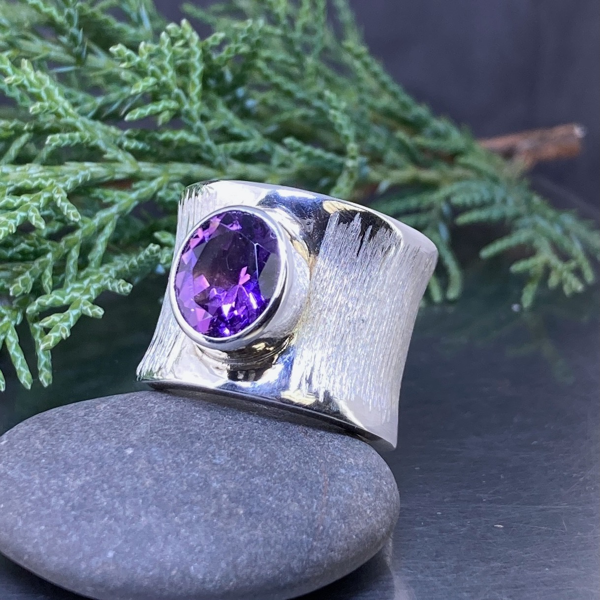 The Amethyst Wide Band Ring in Argentium Silver blends precision and depth. The clean lines of the etched band contrast with the gem’s violet glow. The result is strong, minimal, and balanced — a solid ring that feels calm yet powerful.