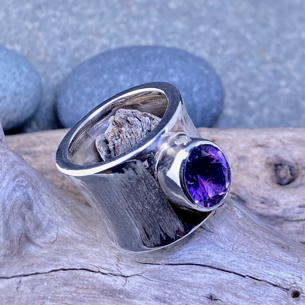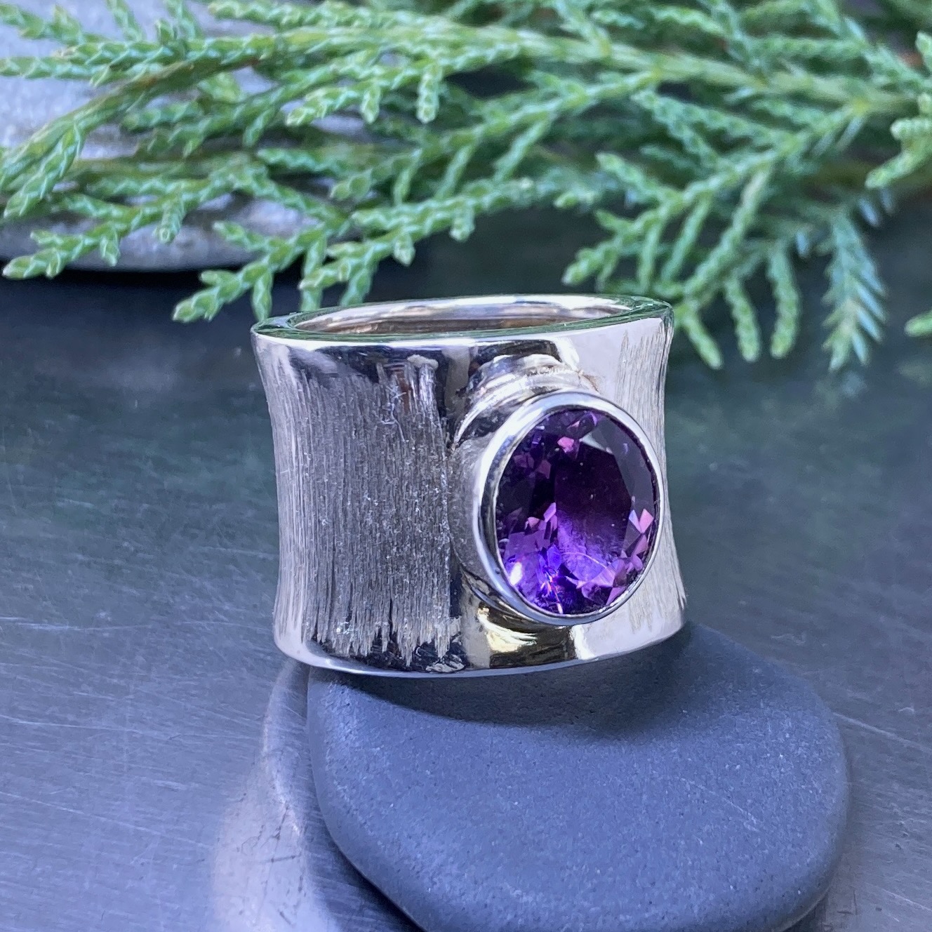 I forge the band from thick silver, then mark and etch the lines by hand. After refining the edges, I polish the surface until it gleams with a soft, even light. The Amethyst is set in a smooth bezel to finish the contrast of silver and violet — simple, elegant, and enduring.