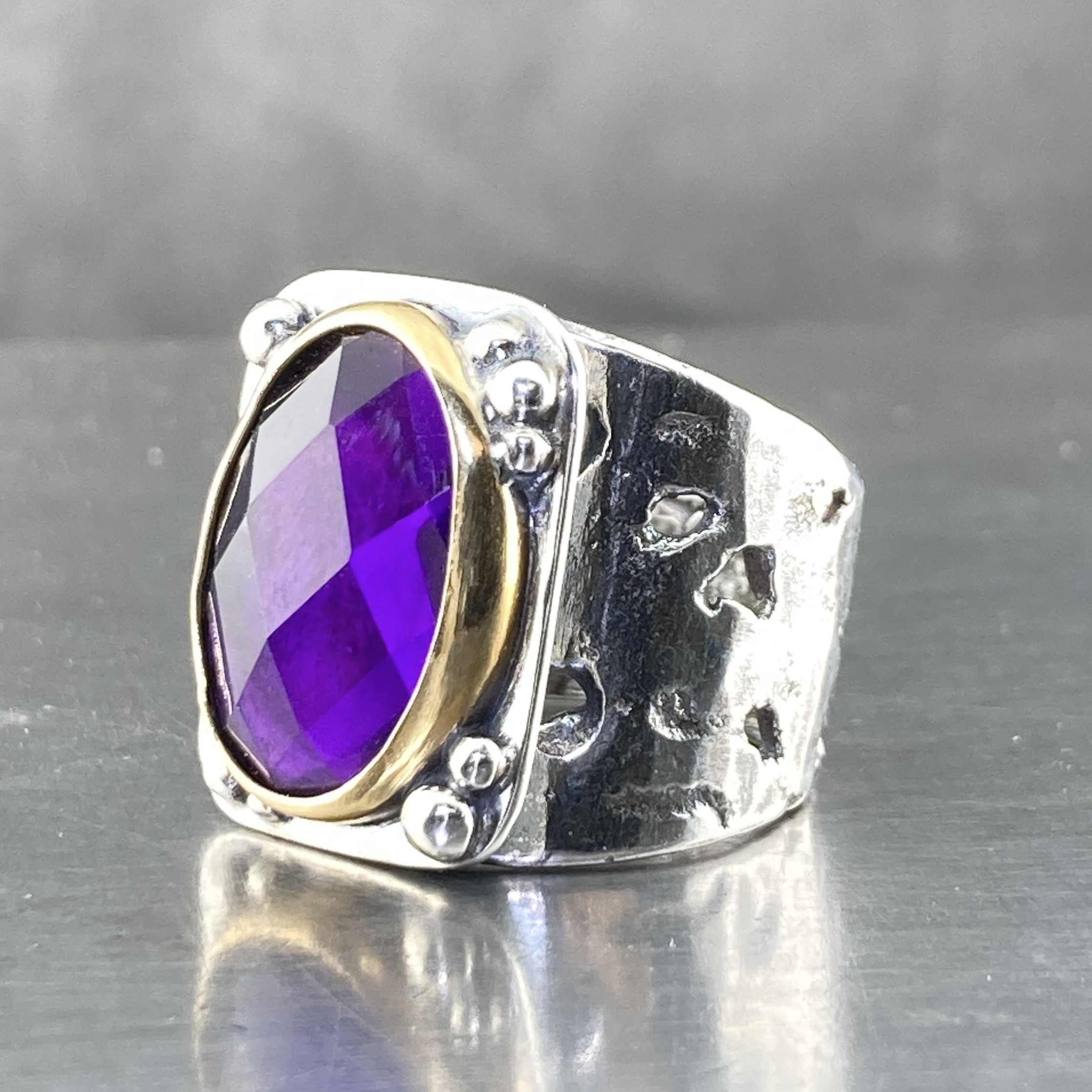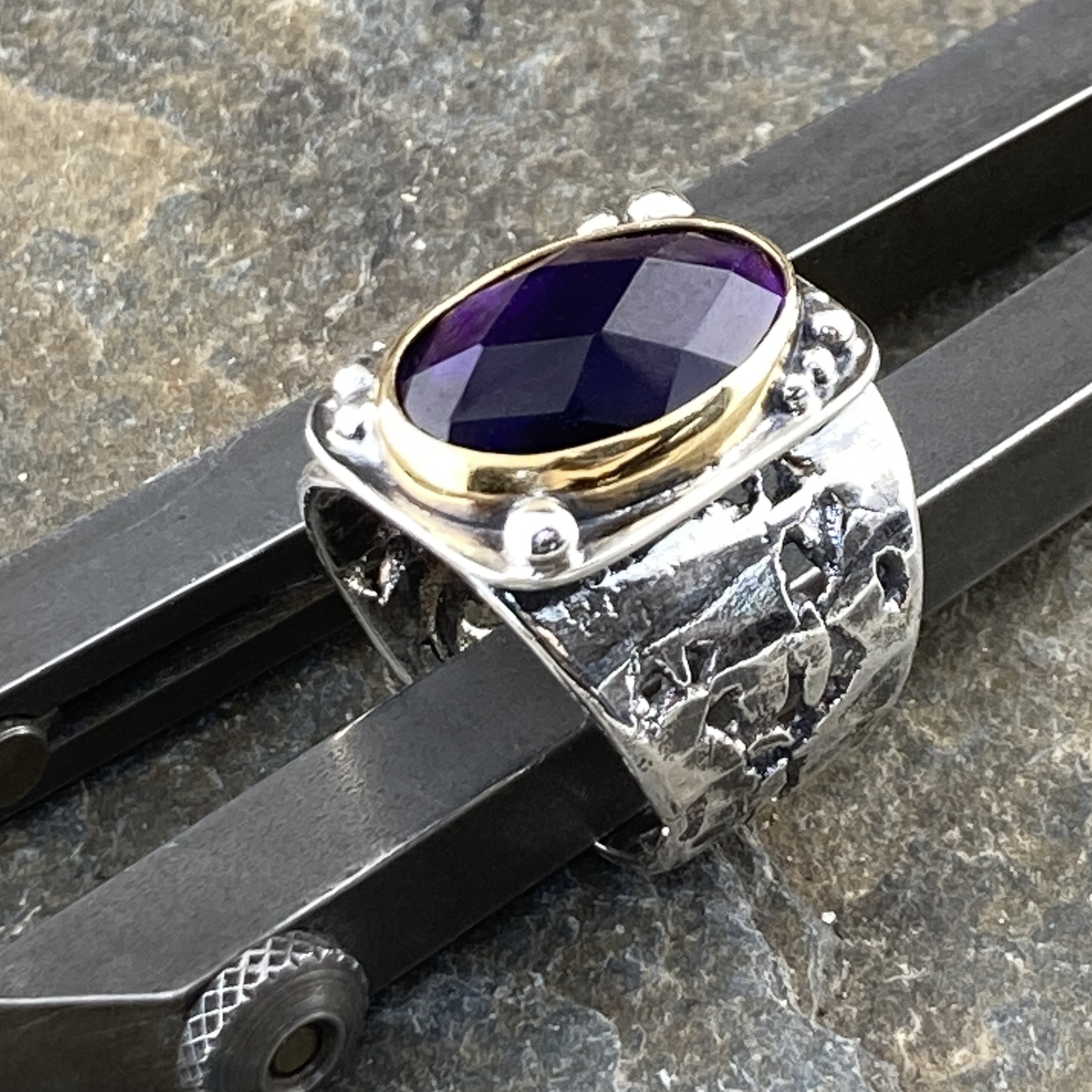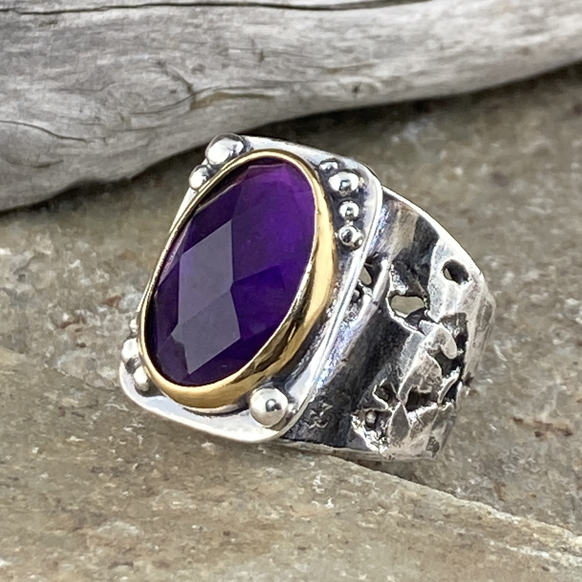 The Amethyst Granules Ring in Argentium Silver and Brass combines texture, warmth, and contrast. The wide band glows with molten shapes and open spaces, reflecting light in shifting tones. The deep purple Amethyst sits above the surface — bright, grounded, and full of quiet power.