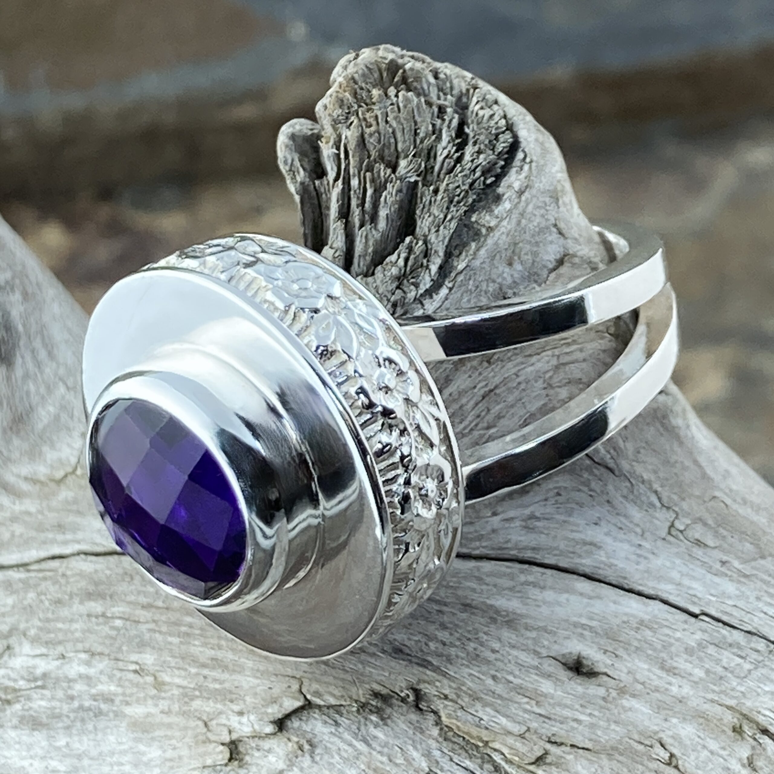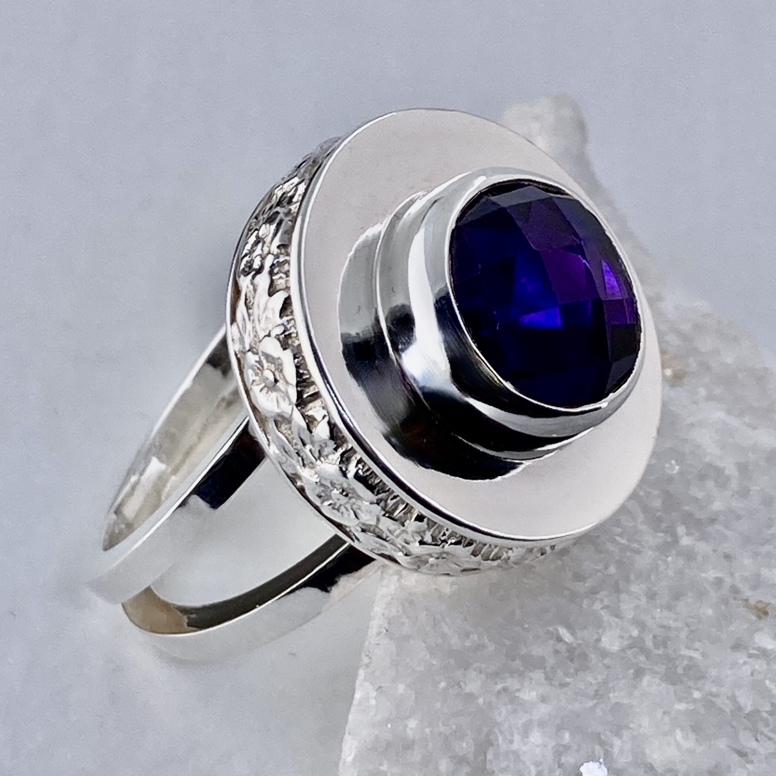 This 7.5-carat round Amethyst shows vivid violet tones with flashes of rose and blue. The bezel setting secures the stone while allowing light to move gently through its facets. As a result, the gemstone appears to float above the silver like a full moon framed by night sky.