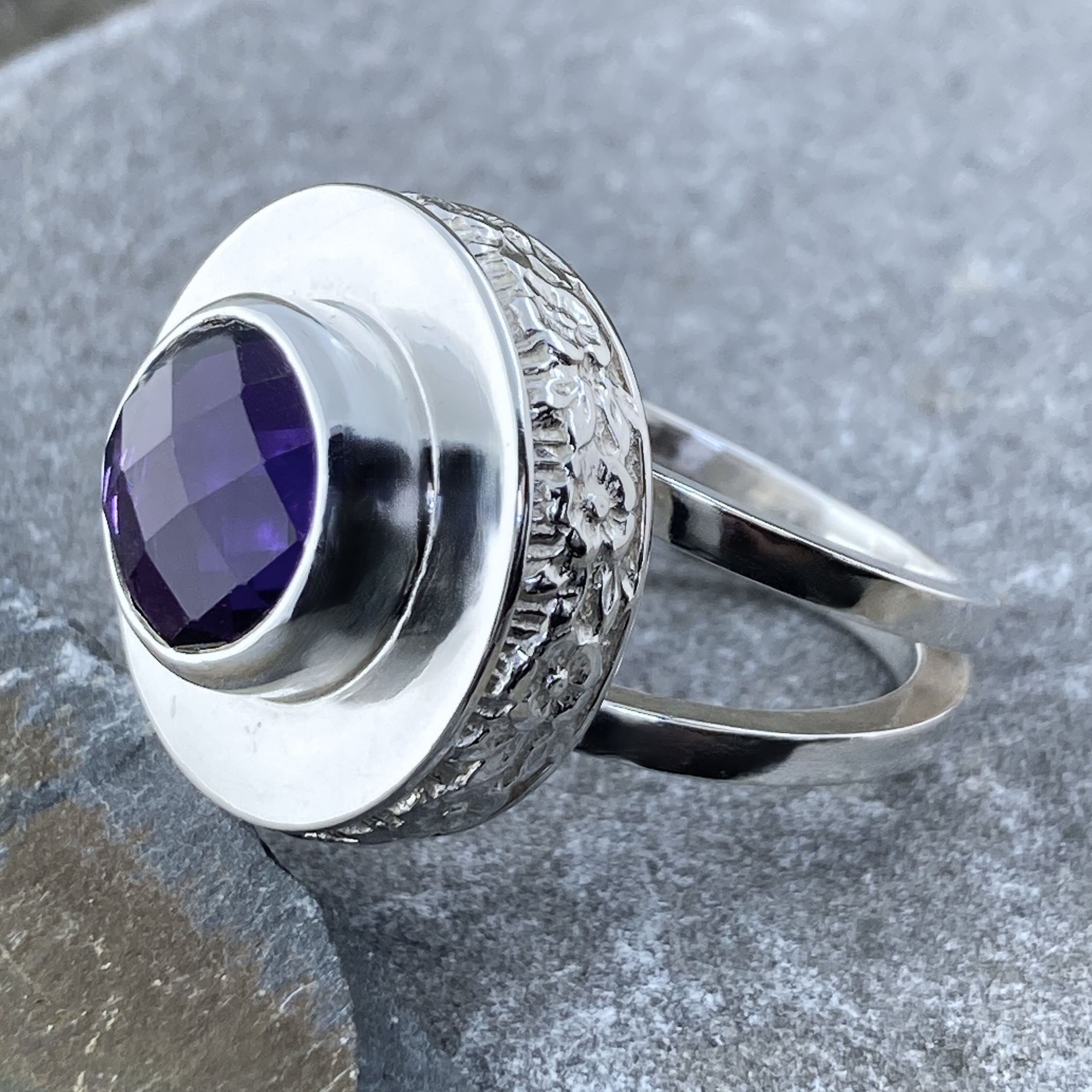Amethyst Argentium Silver Ring Size 9.25 glows with celestial colour and balance. The Full Moon design pairs a textured circle of silver with a curved side band, echoing the quiet rhythm of lunar light.