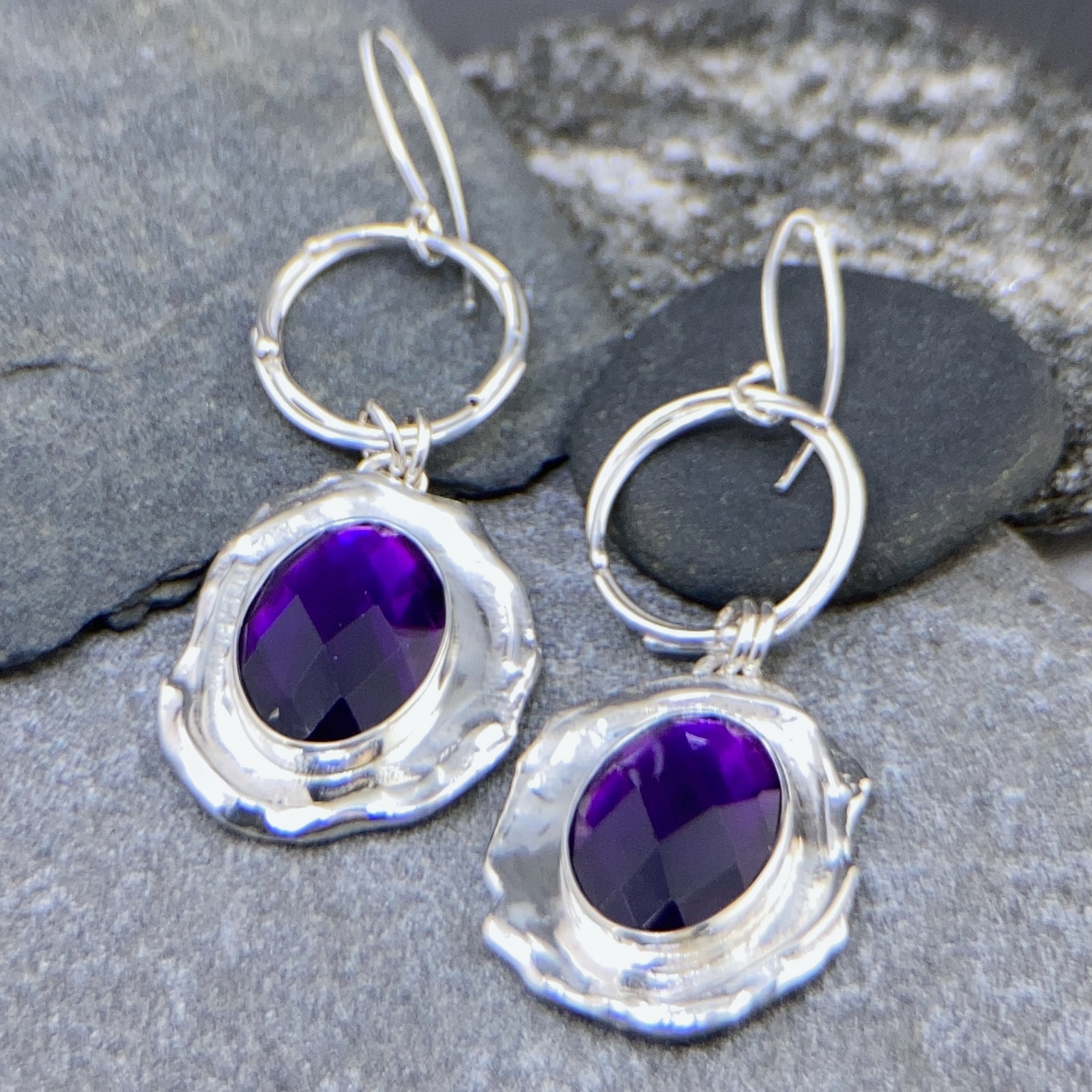 Amethyst with a facetted finish, set in a bezel on a melted silver Boulder.