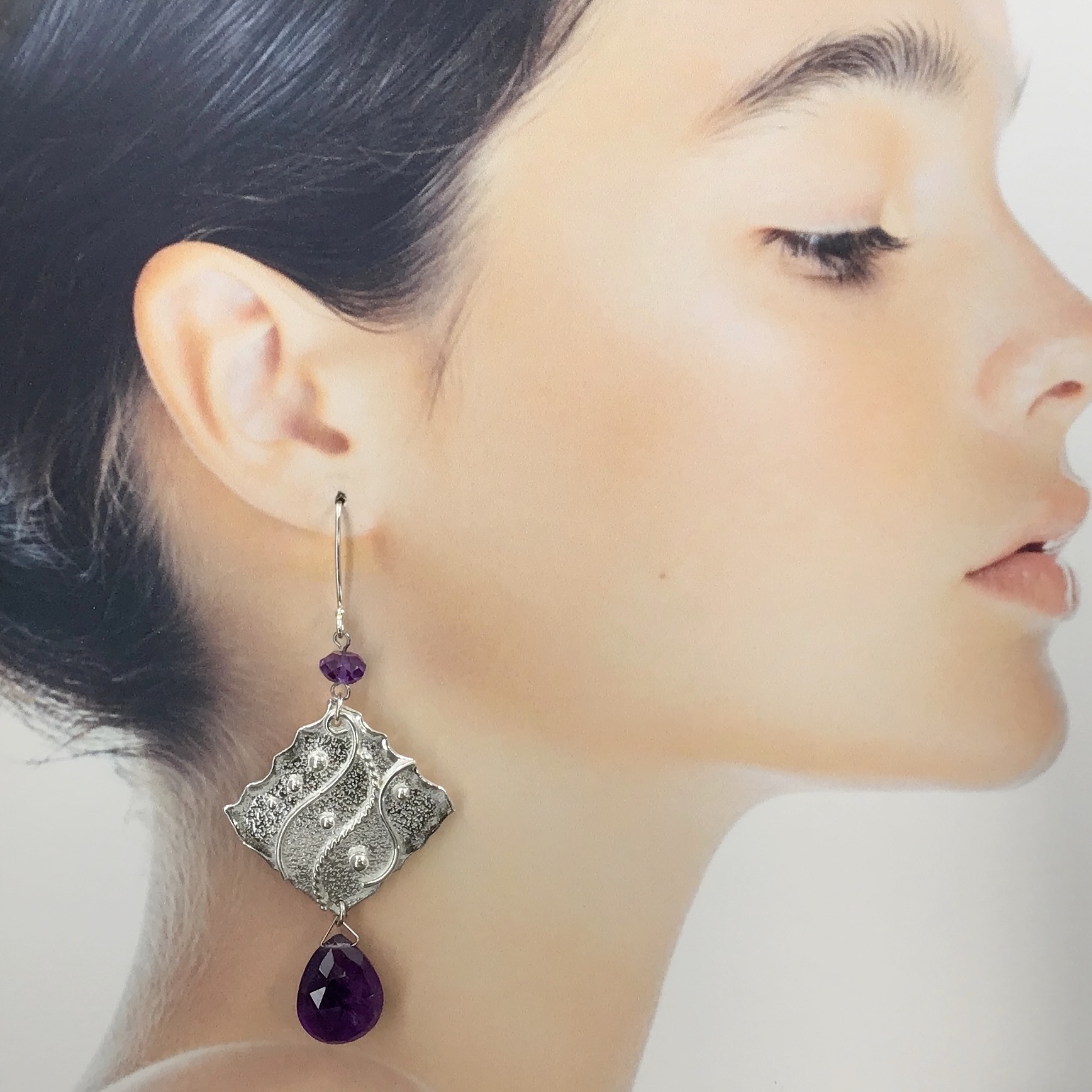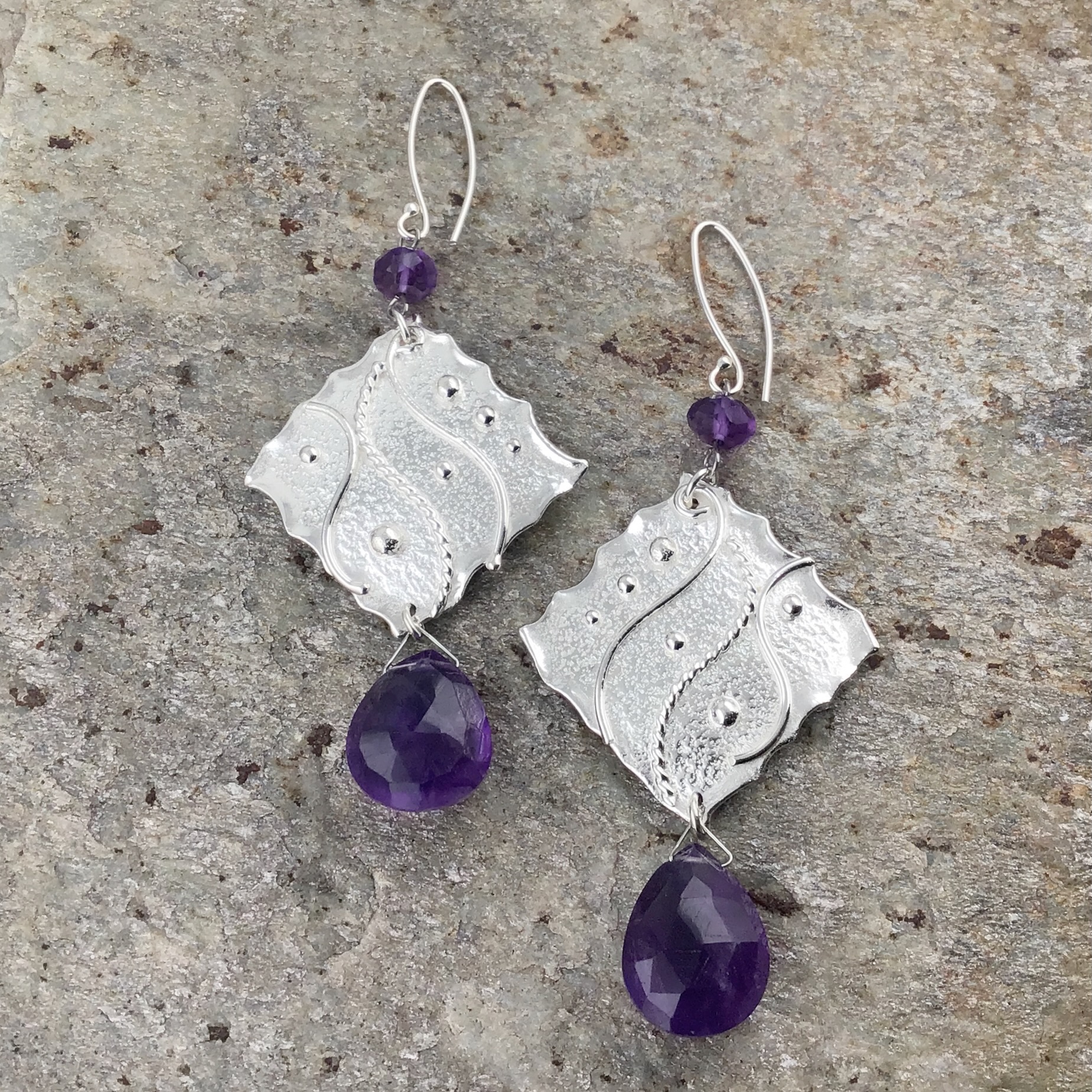 Amethyst teardrops dangle from this solid Argentium silver Water design earring.