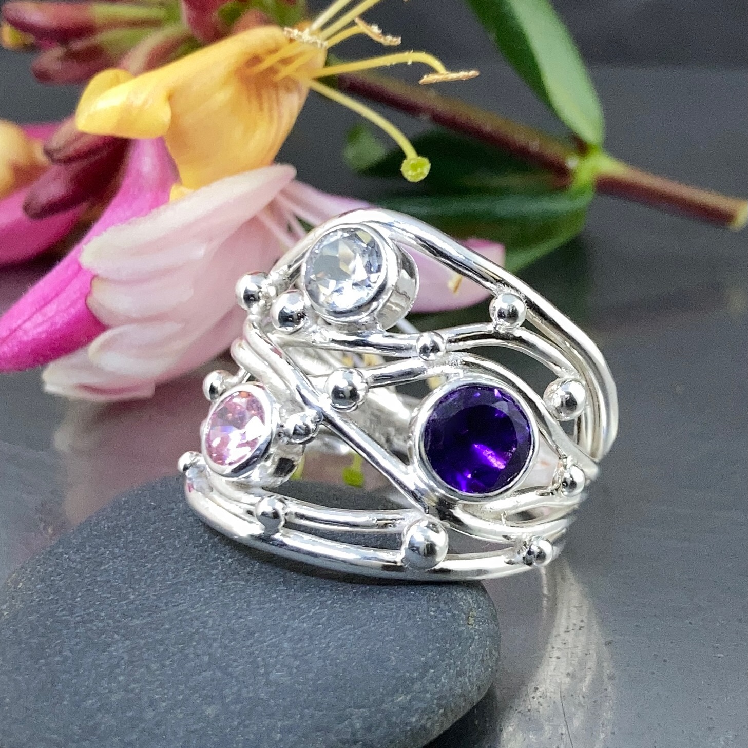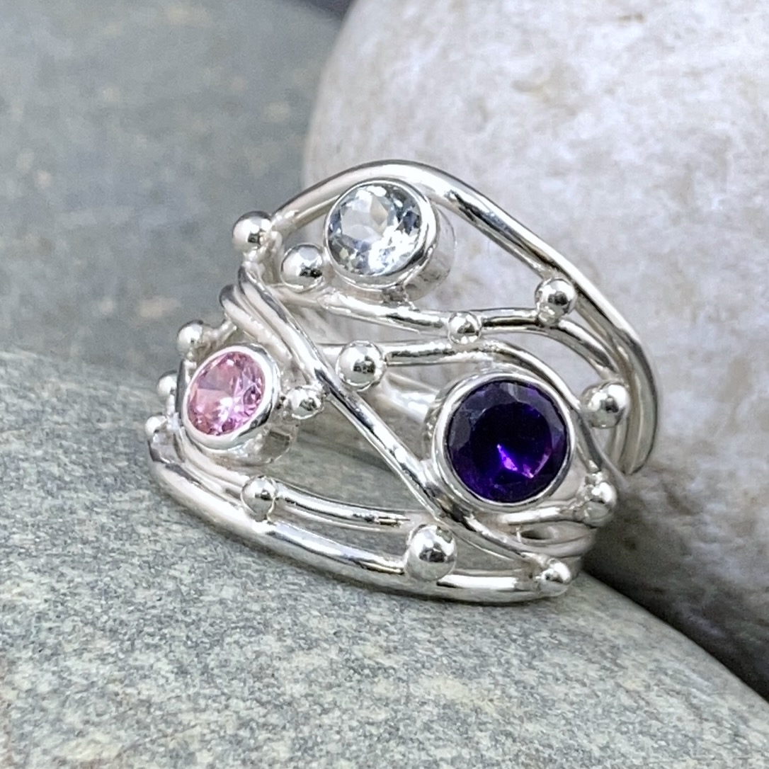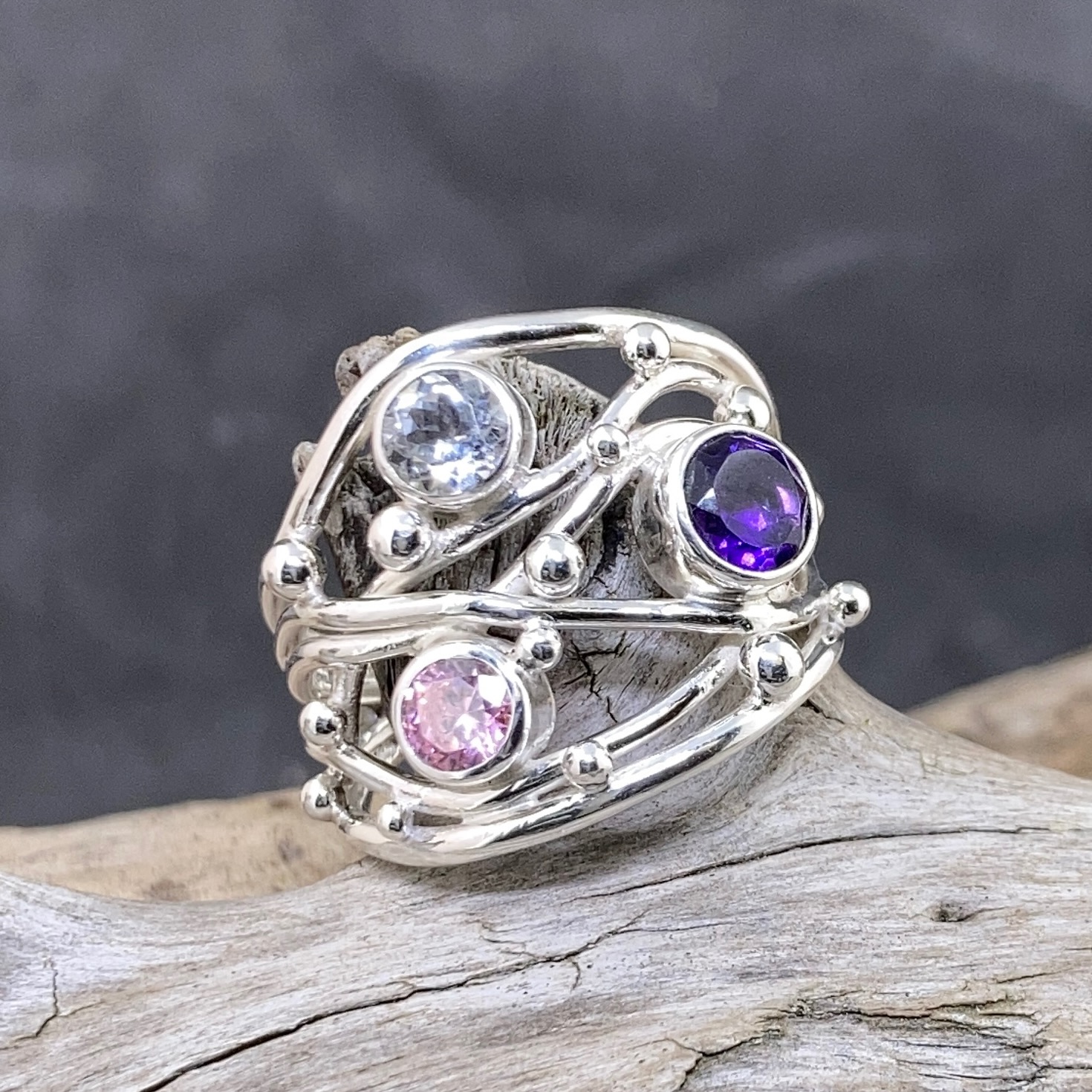 Handmade triple-stone ring in Argentium silver with a Vine Band design. Features Amethyst, White Topaz, and Pink Cubic Zirconia in flowing silver vines.