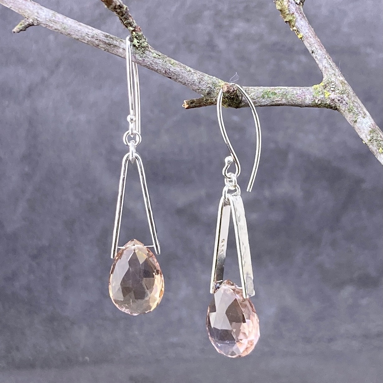 A hand hammered Argentium silver V bail with hand formed Argentium silver ear wires.