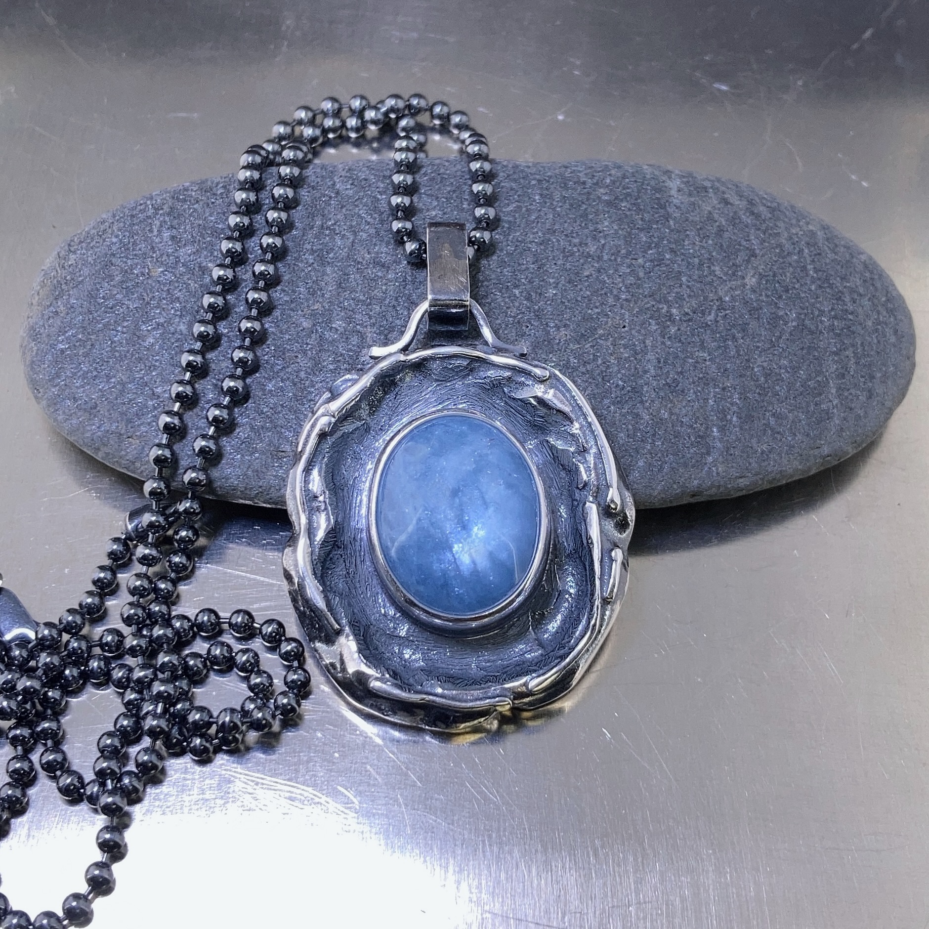 I select a gemstone to compliment the ‘wax seal’. For this pendant I chose a freeform, cabochon-cut Aquamarine. I hand make the bezel for each gemstone, which I then soldered to the pendant base. And then I solder on a bail. Lots of polishing and shaping has to happen before the final antique patina can be applied.