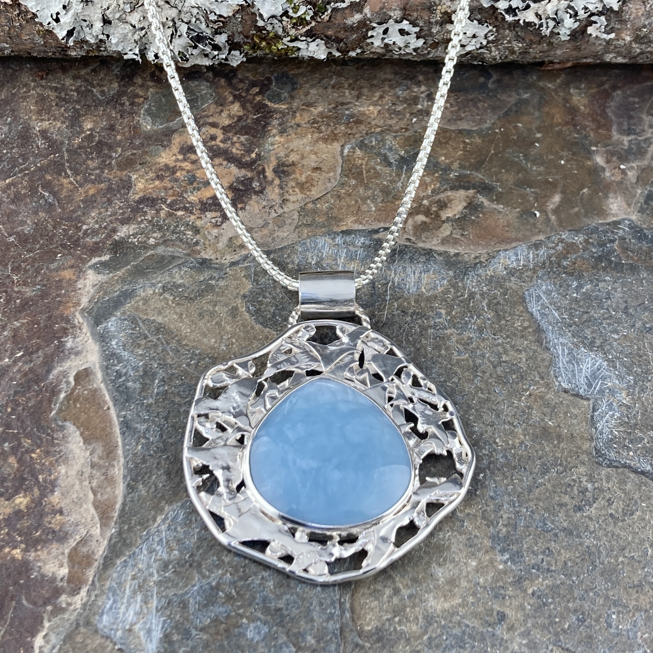 Aquamarine is 33.5 carats in a teardrop shaped cabochon. The smooth cabochon finish enhances the colour and texture of this semi-precious Aquamarine. Which contrasts with the rugged texture of the Rapids design Argentium silver. Made by melting and fusing small bits of silver until a complete rapids experience is accomplished.