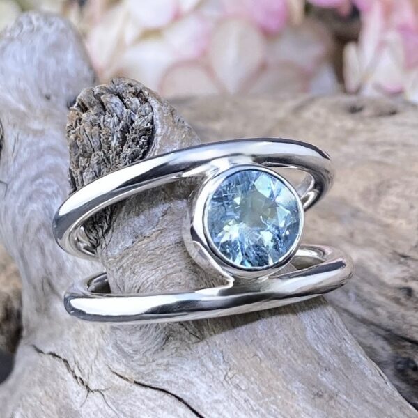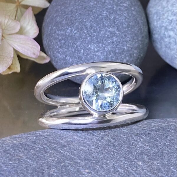 A clean and balanced Round Double-Band ring crafted from solid Argentium silver. The 1.75 carat brilliant-cut Aquamarine is nestled between two polished bands, creating a bright, modern look. The design combines strength, symmetry, and comfort — a true STRUCTURE classic.