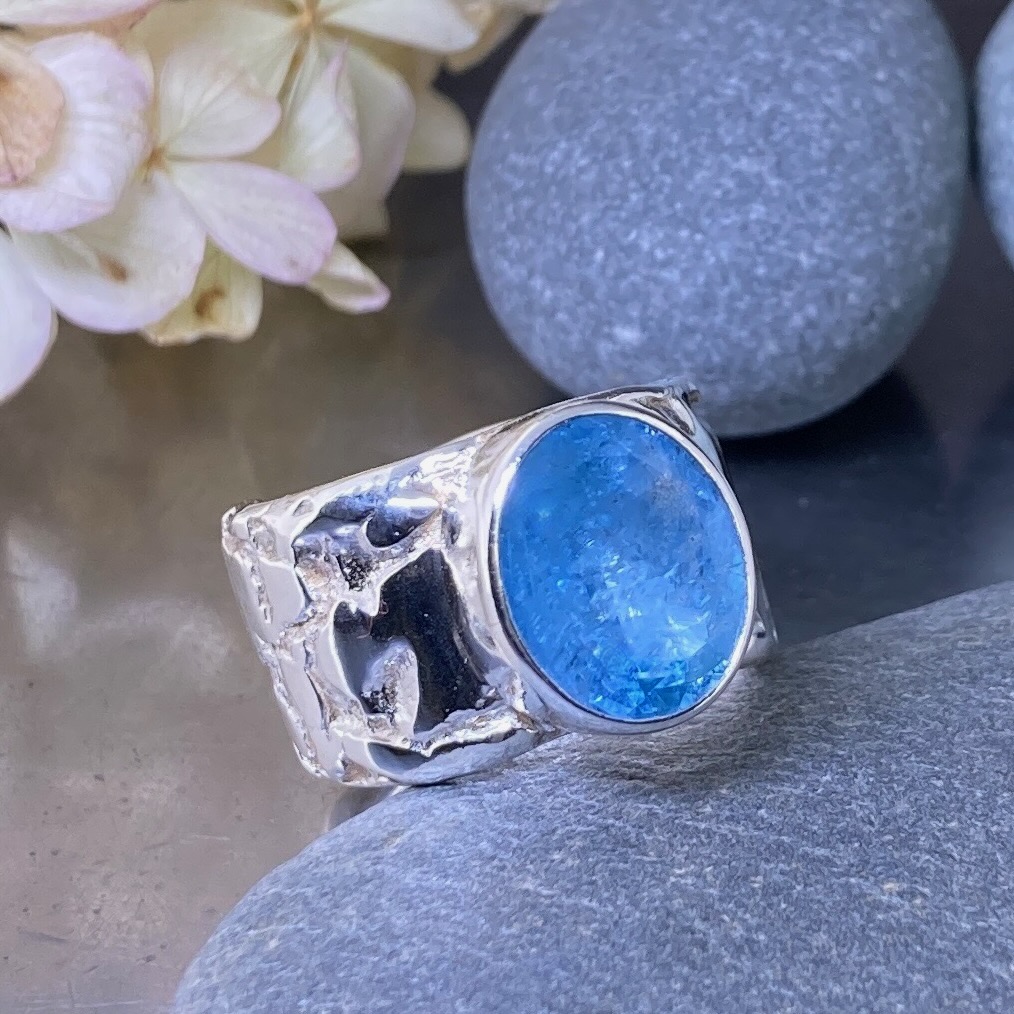 I melt pure Argentium silver into an ingot, then hammer and roll it to form the band. The texture comes from each strike and reheat, creating a one-of-a-kind pattern. After forming and setting the stone, I polish the edges to catch light like sunlight on water.