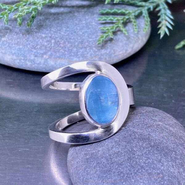 Aquamarine oval in a cabochon cut, tucked into a Buttonhole design ring.