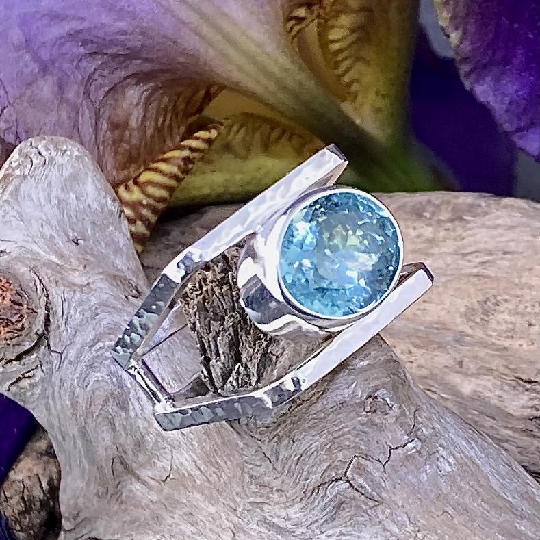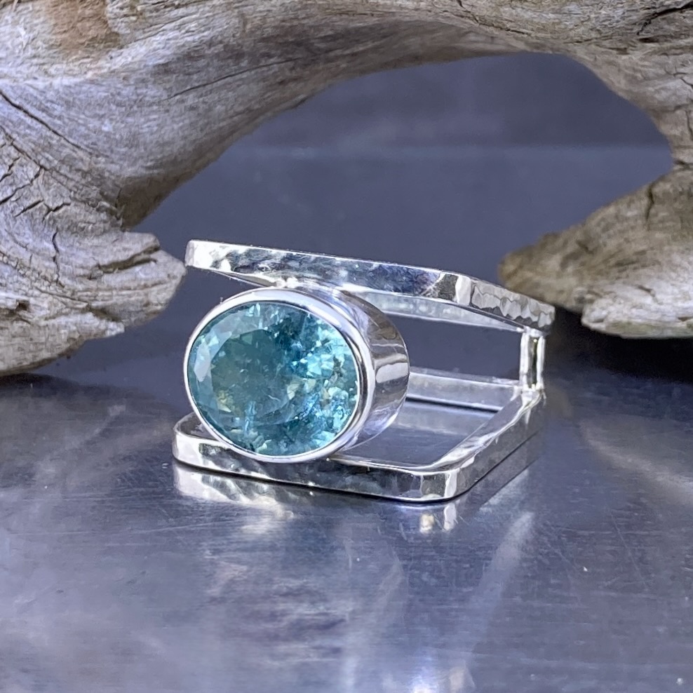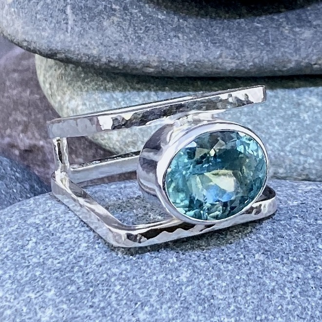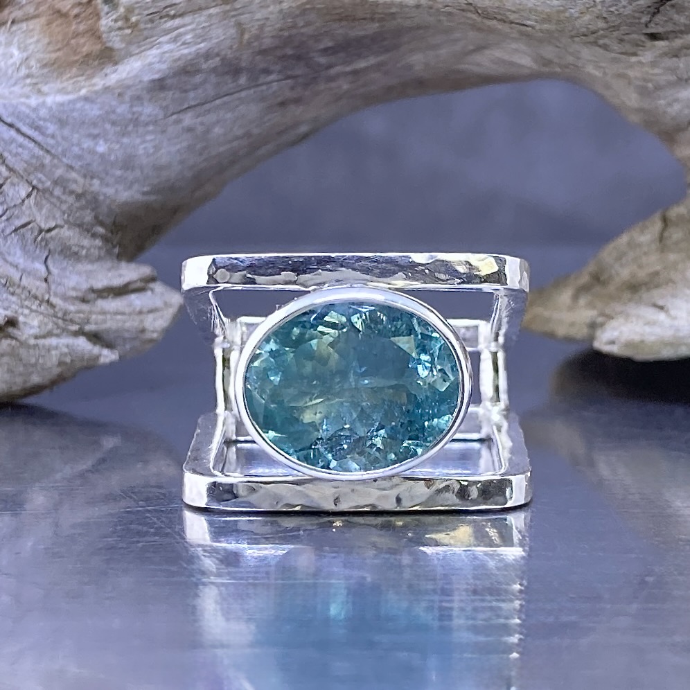 The Aquamarine Ring Size 7 Argentium Silver Double Square design captures strength and balance. Two square bands rise together to frame a 3.5 carat natural Aquamarine. The bezel setting holds the oval-cut stone securely while showing its clear, sea-blue tone. Hammered texture across the silver adds light and rhythm to the bold form.