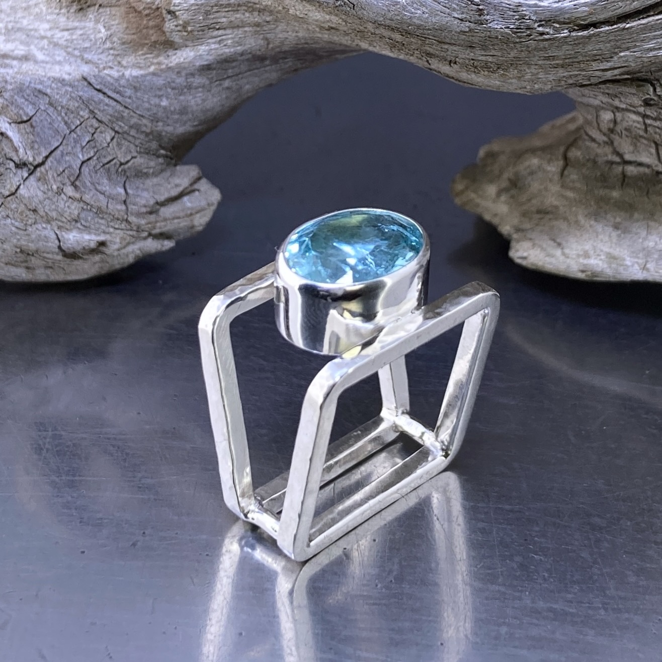 Handmade Aquamarine Double Square design ring in Argentium silver. Bold structure with bezel-set gemstone and smooth, easy fit.