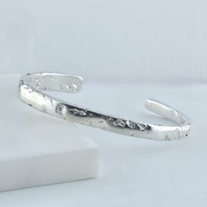 Crafted in Argentium 940 silver — bright, tarnish-resistant, and nickel-free — with an antique finish that highlights its wave-like form. Wipe gently with a soft, dry cloth after wear and avoid dips or harsh polishes. Learn more: