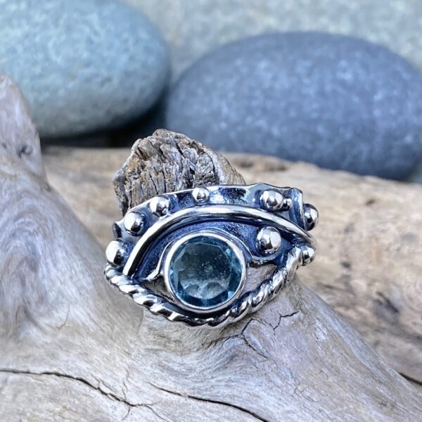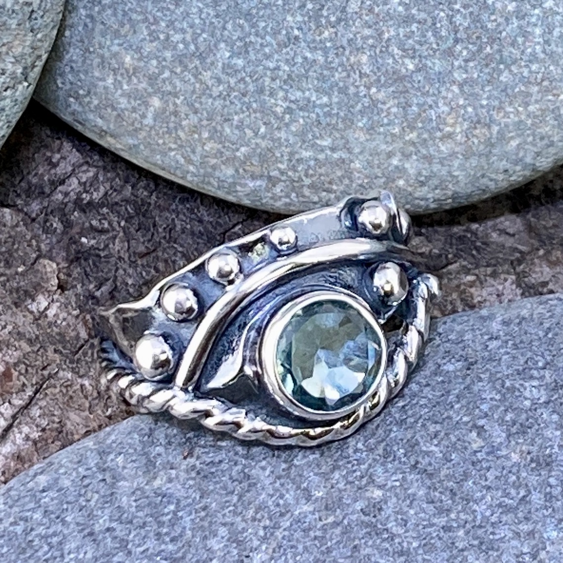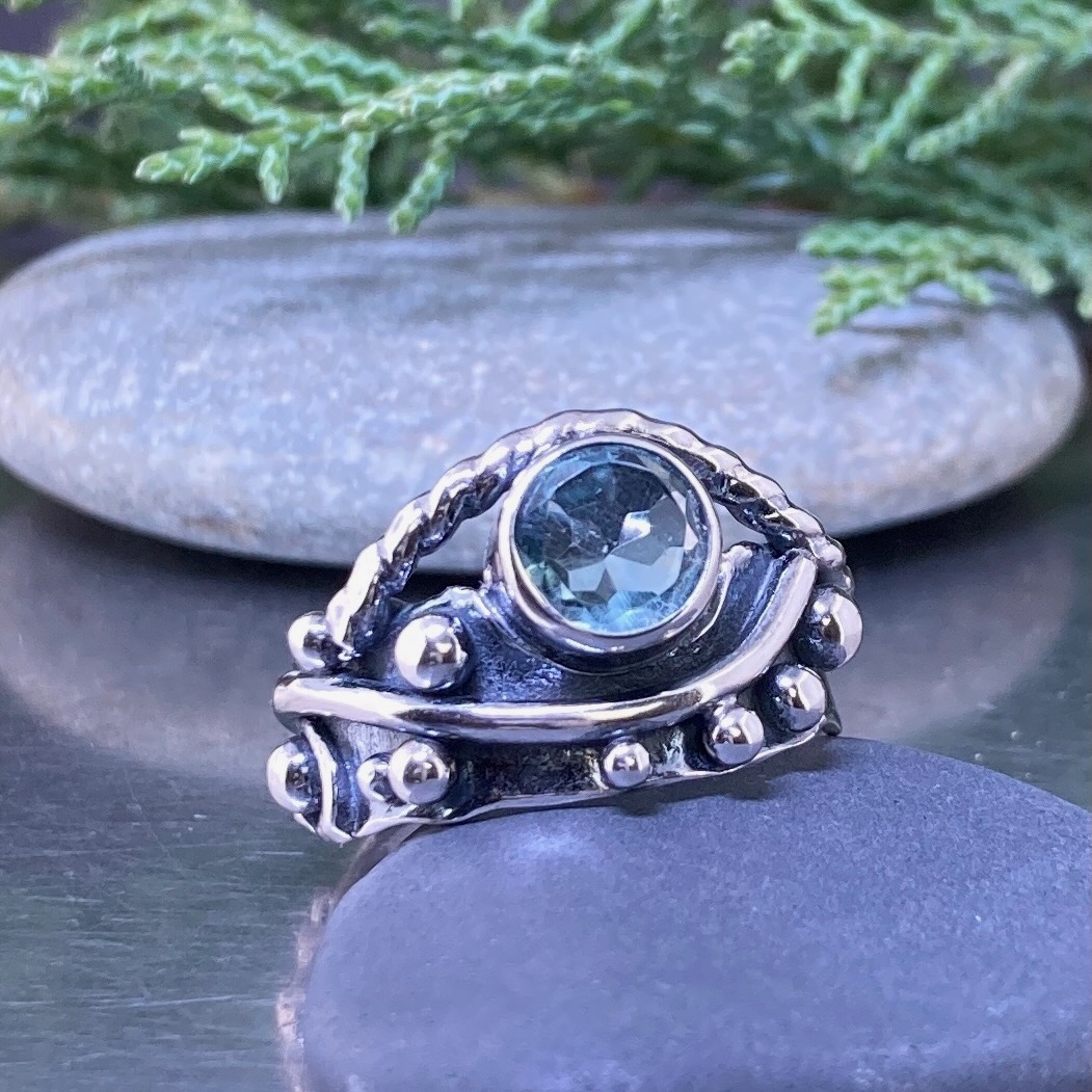This 1 carat Aquamarine shows a pale sea-blue tone — clear, gentle, and luminous. Its brilliant cut reflects light in calm flashes that complement the antique finish of the silver. The gem’s quiet glow mirrors the clarity of water itself.