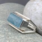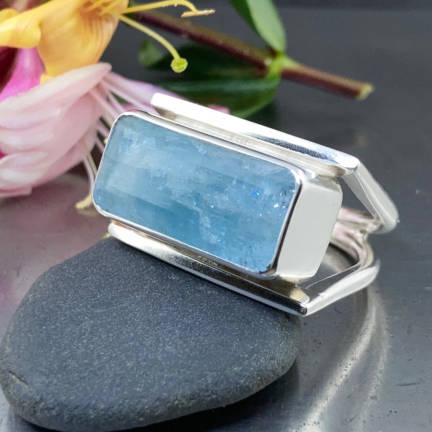 Each Double-D band begins as a thick strip of Argentium silver. I shape it under heat, refining the curve until it forms a clean D profile. The two halves are fused, not soldered, for seamless strength. Finally, I set the Aquamarine into its custom bezel, where the geometry of the stone meets the discipline of the band.