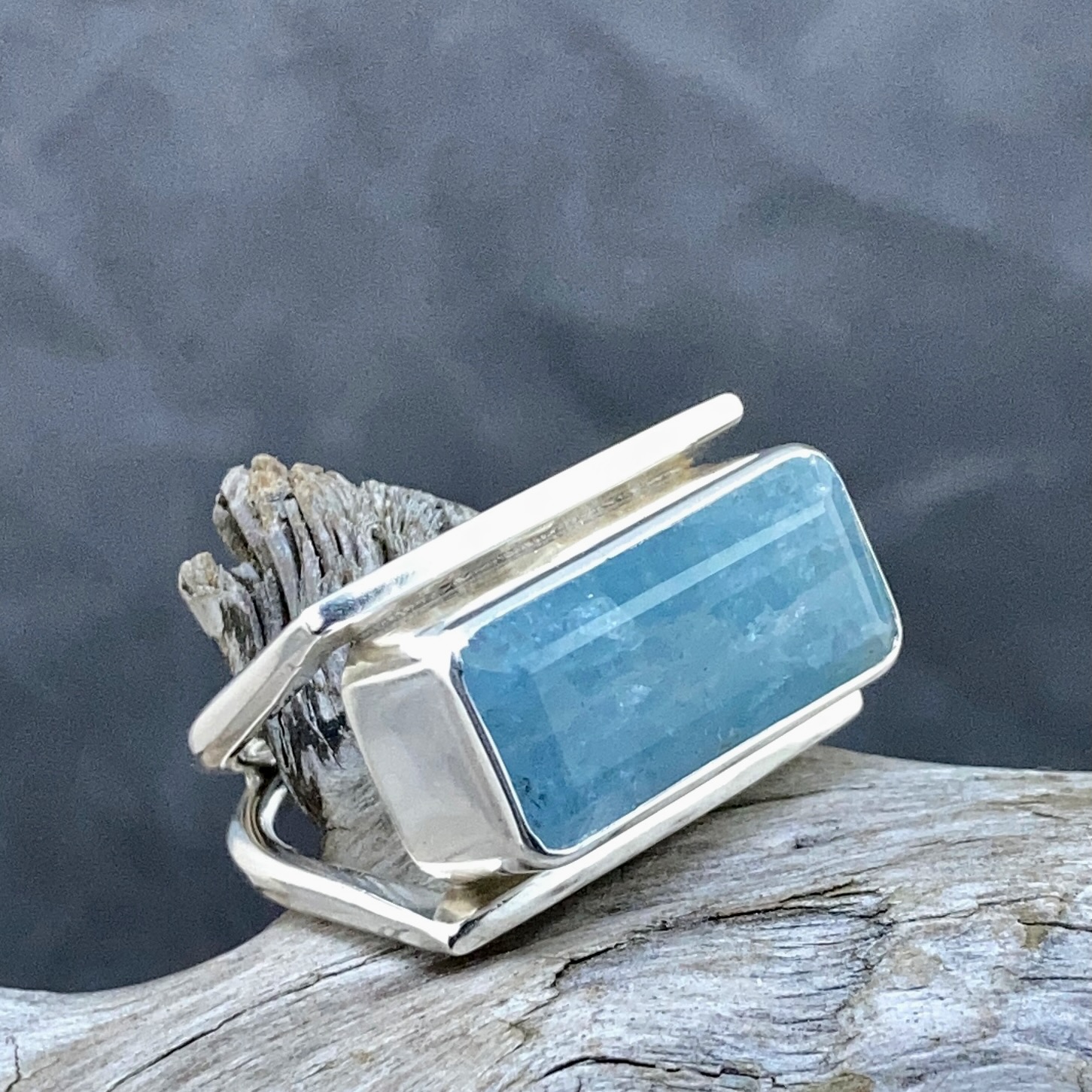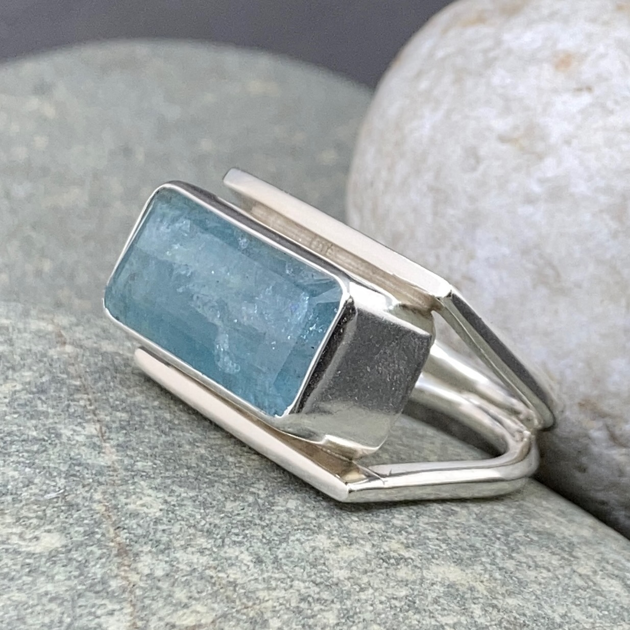The Aquamarine Double-D Band ring embodies precision and strength. Its heavy Argentium silver band and square-cut gemstone form a deliberate, architectural balance between structure and light.