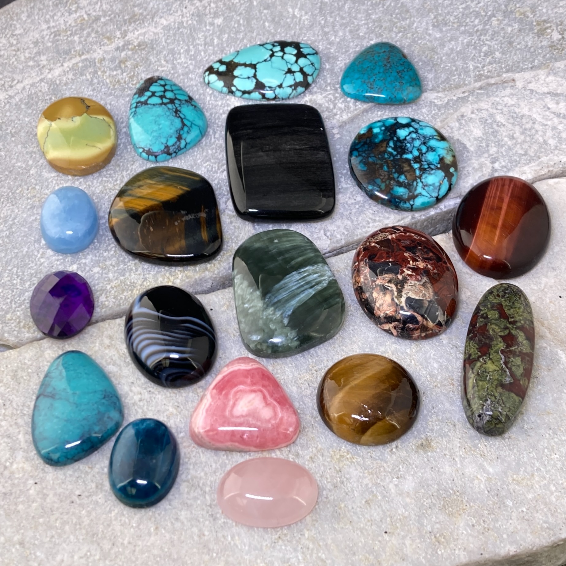 Smooth cabochons are ideal for bezel setting. A curated tray (e.g., turquoise, labradorite, larimar, amethyst) is provided (see photo of available stones) —each stone is unique, so every pendant is one-of-a-kind.