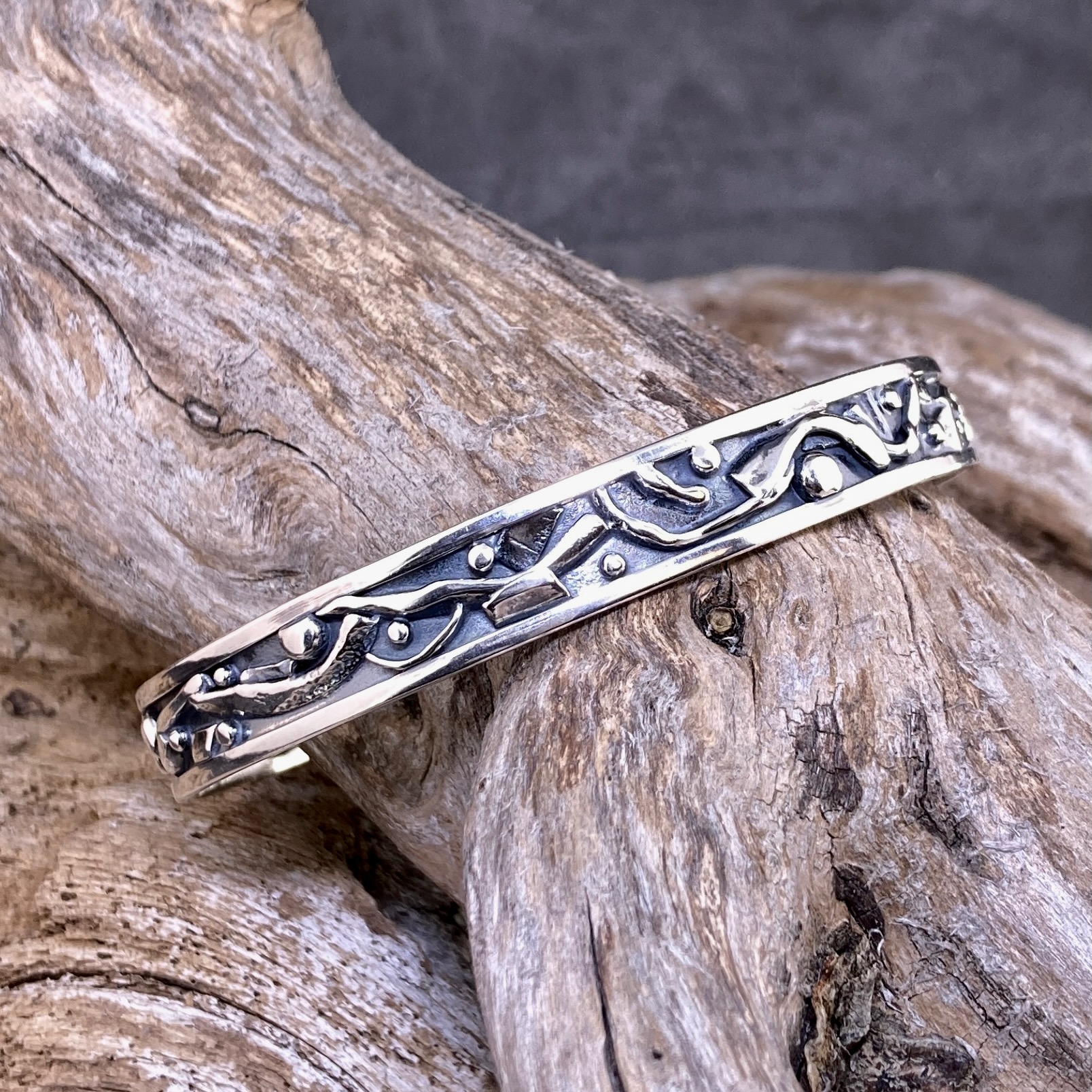 I start with separate bits of Argentium silver and melt them into a single, fluid surface. Then I fuse silver wire along both edges to create a smooth, framed outline that feels comfortable on the wrist. After shaping and polishing, I tumble each piece for strength and a soft sheen. Finally, I apply the antique finish, which becomes part of the silver itself. This finish is permanent and never needs polishing. The result is a bracelet that feels solid and expressive — a bold reflection of moving water.