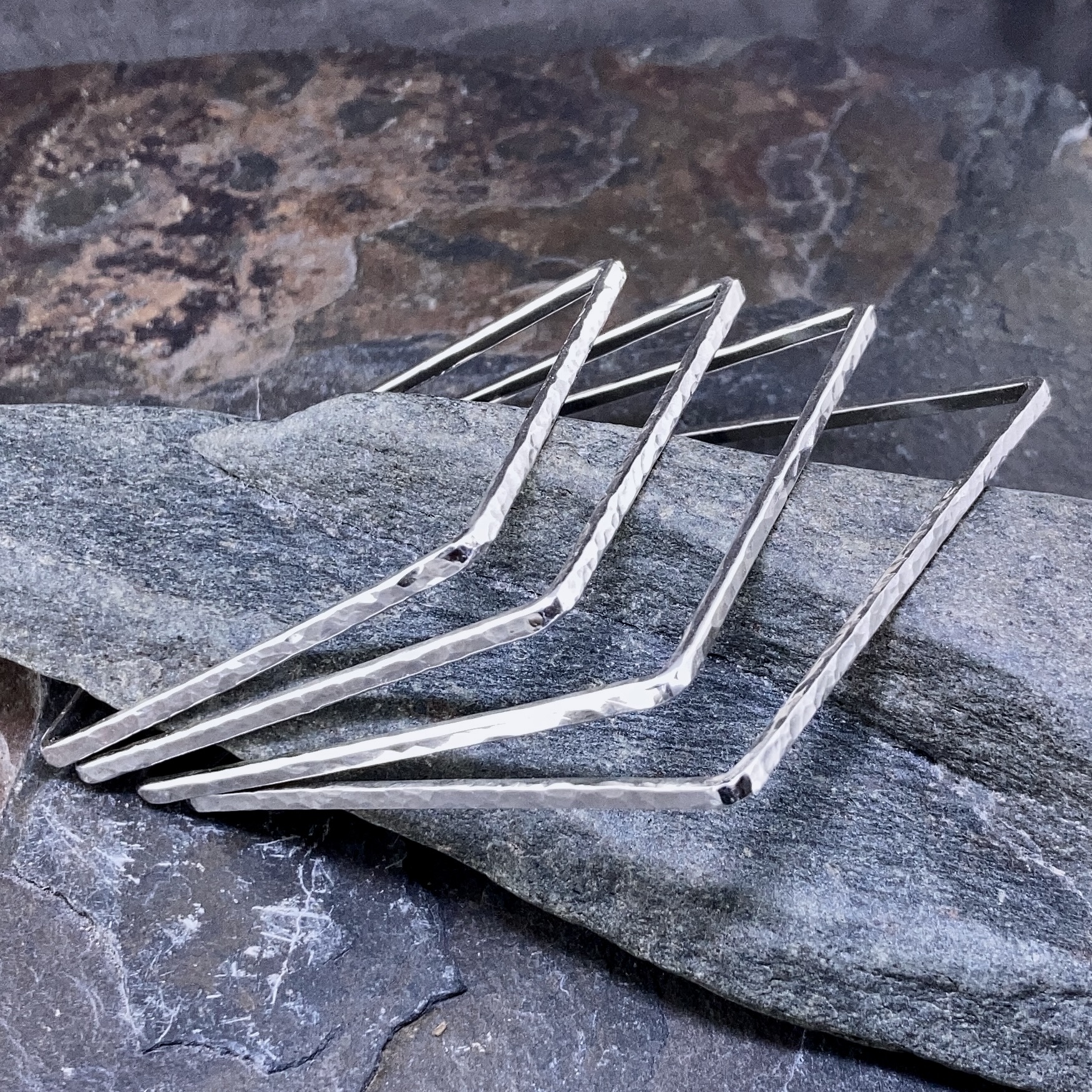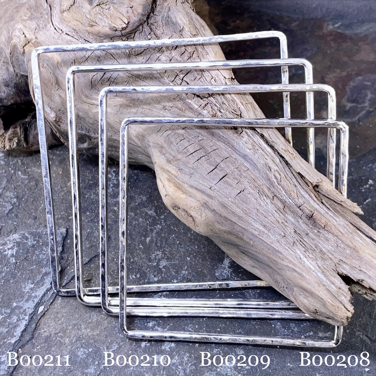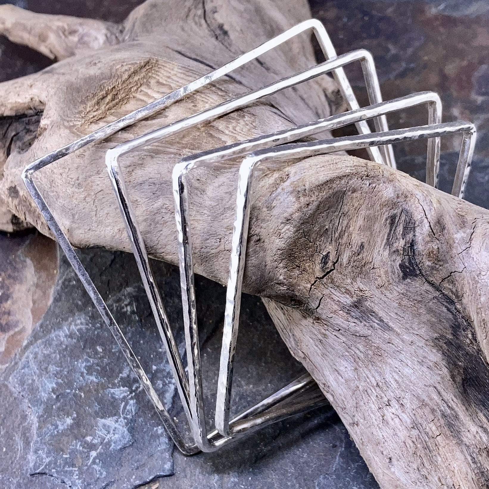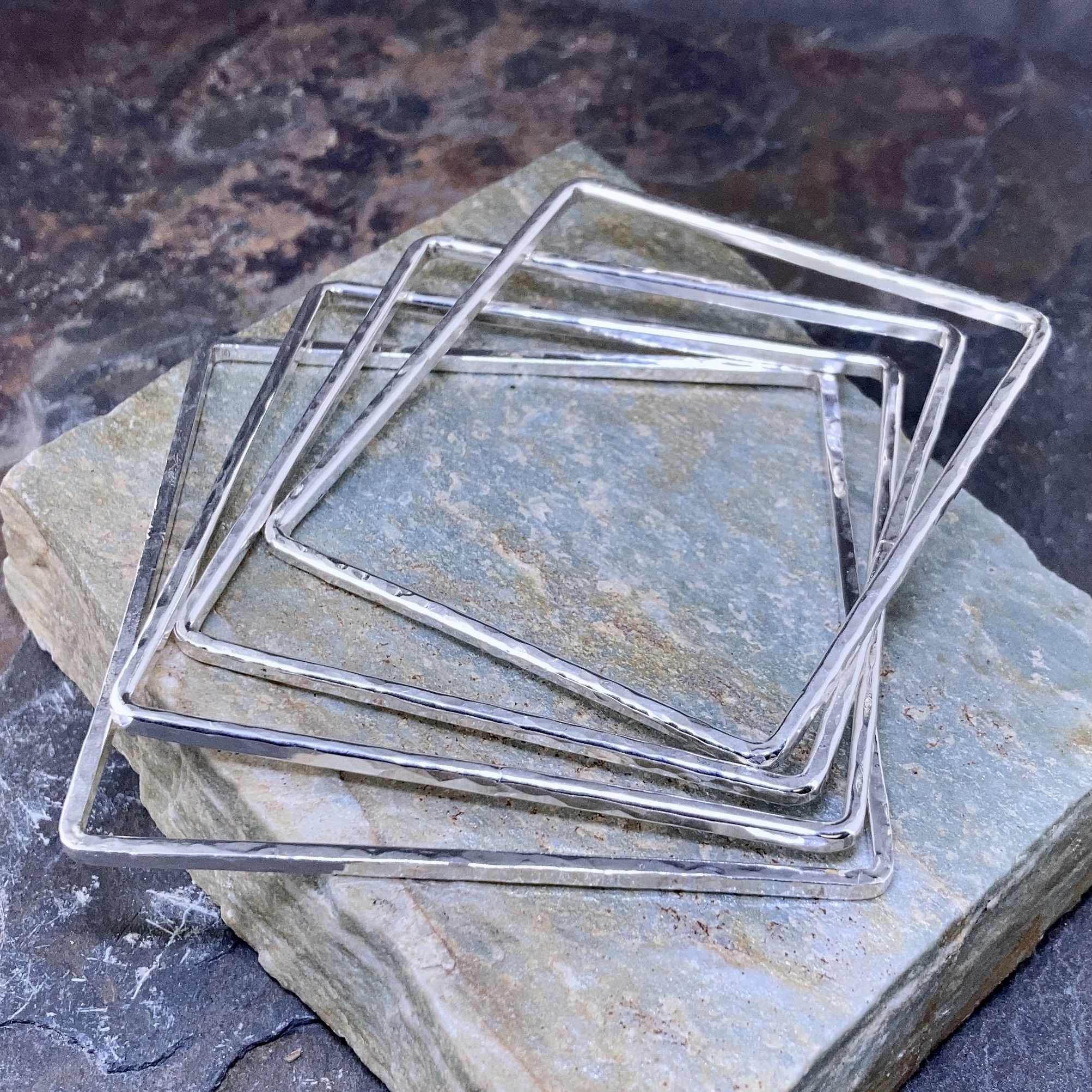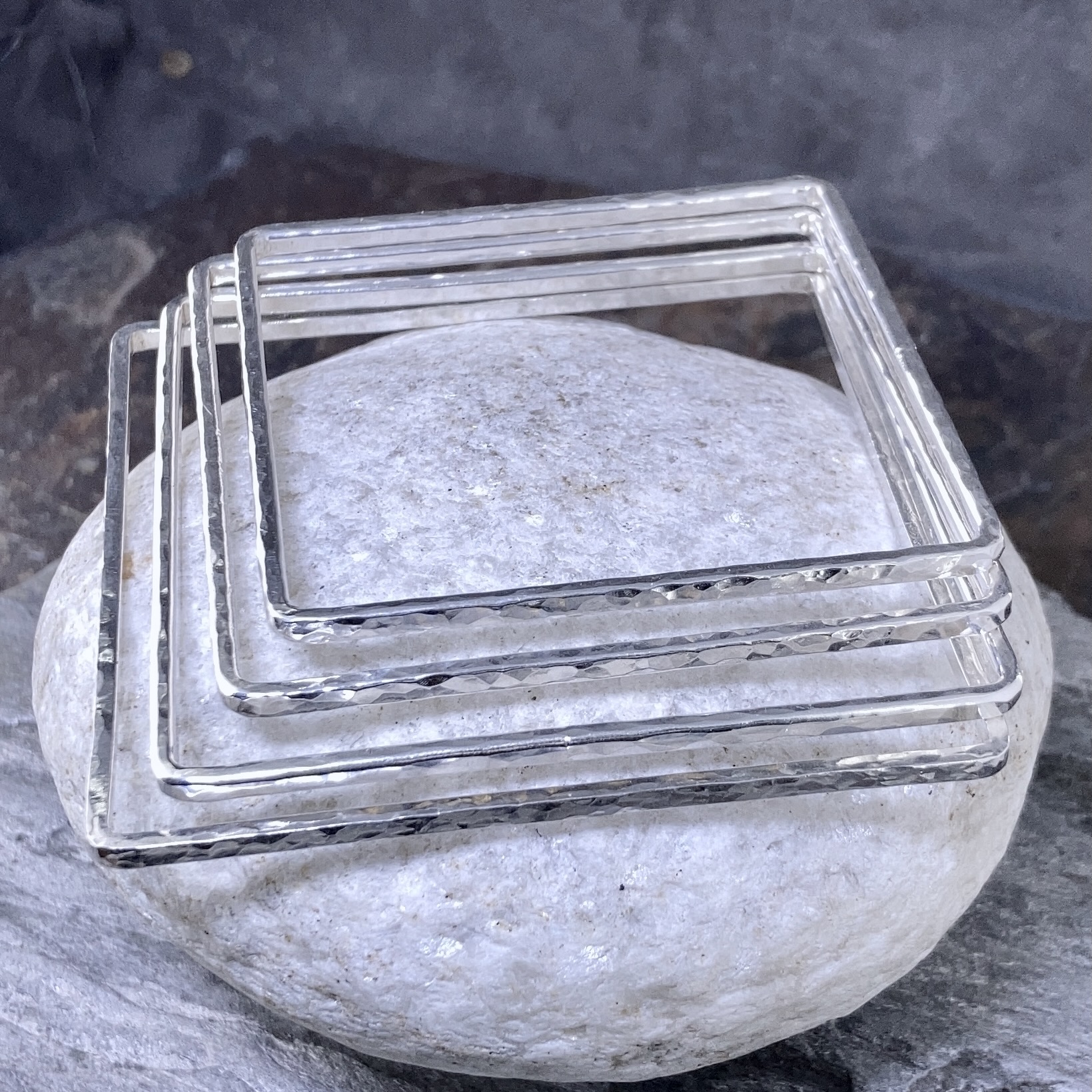 First, we cut and forge Argentium silver wire to create the square outline. Next, we hammer each side by hand to add movement and texture. Then, we round the corners and smooth the inside for comfort. After that, we harden the silver for strength and durability. Finally, we polish the surface to a mirror finish. As a result, each bangle shows a perfect mix of geometry, craftsmanship, and light.