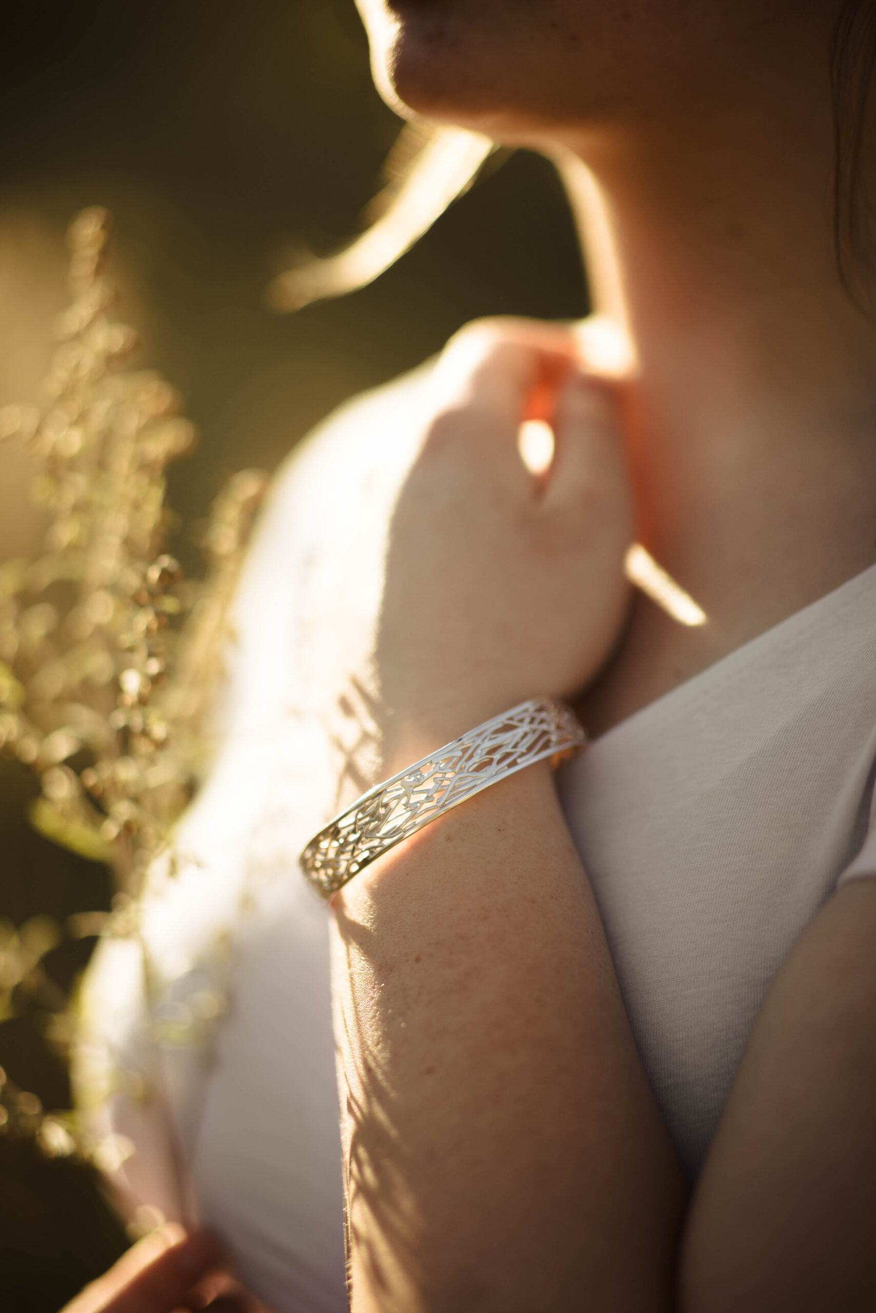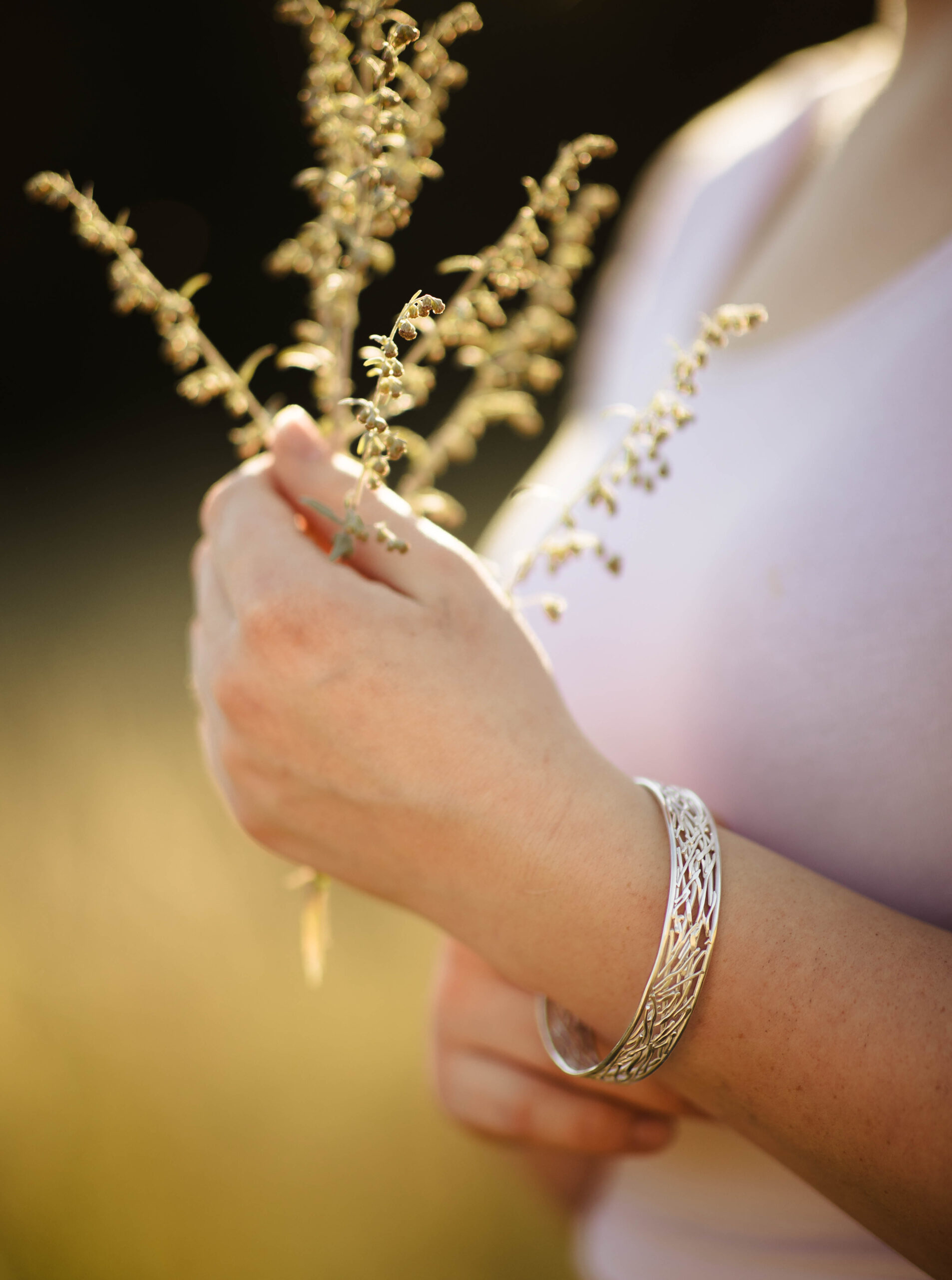 Wear the Argentium Twigs Bangle XLarge alone for sculptural presence. Or, pair it with a polished Bark bangle; the contrast between open twigs and solid texture adds movement while the finishes tie the look together.