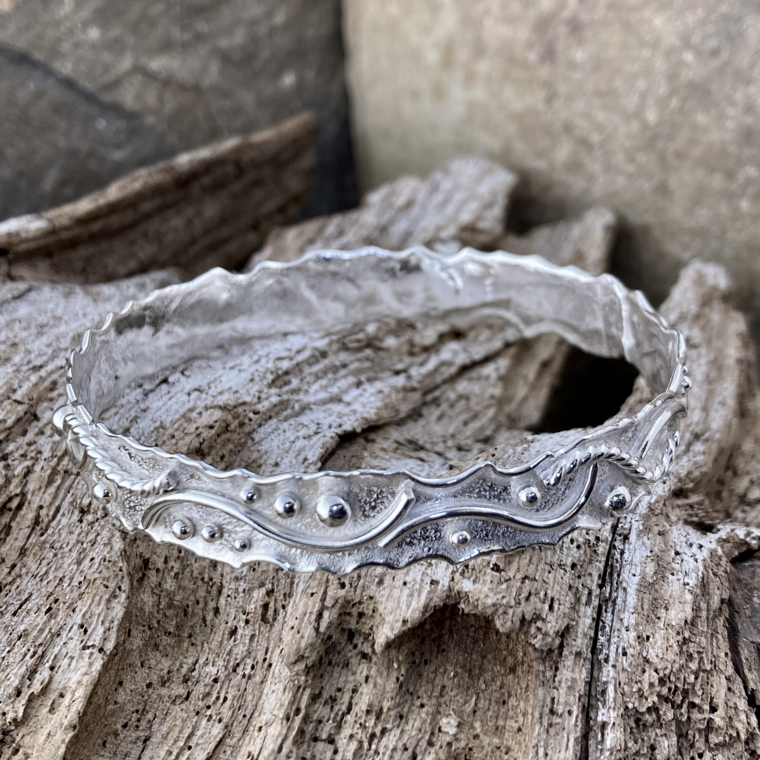 The Argentium Silver Waves Bangle moves like water — bright, flowing, and full of motion. Its softly melted edge and fused silver textures create a design that feels alive.