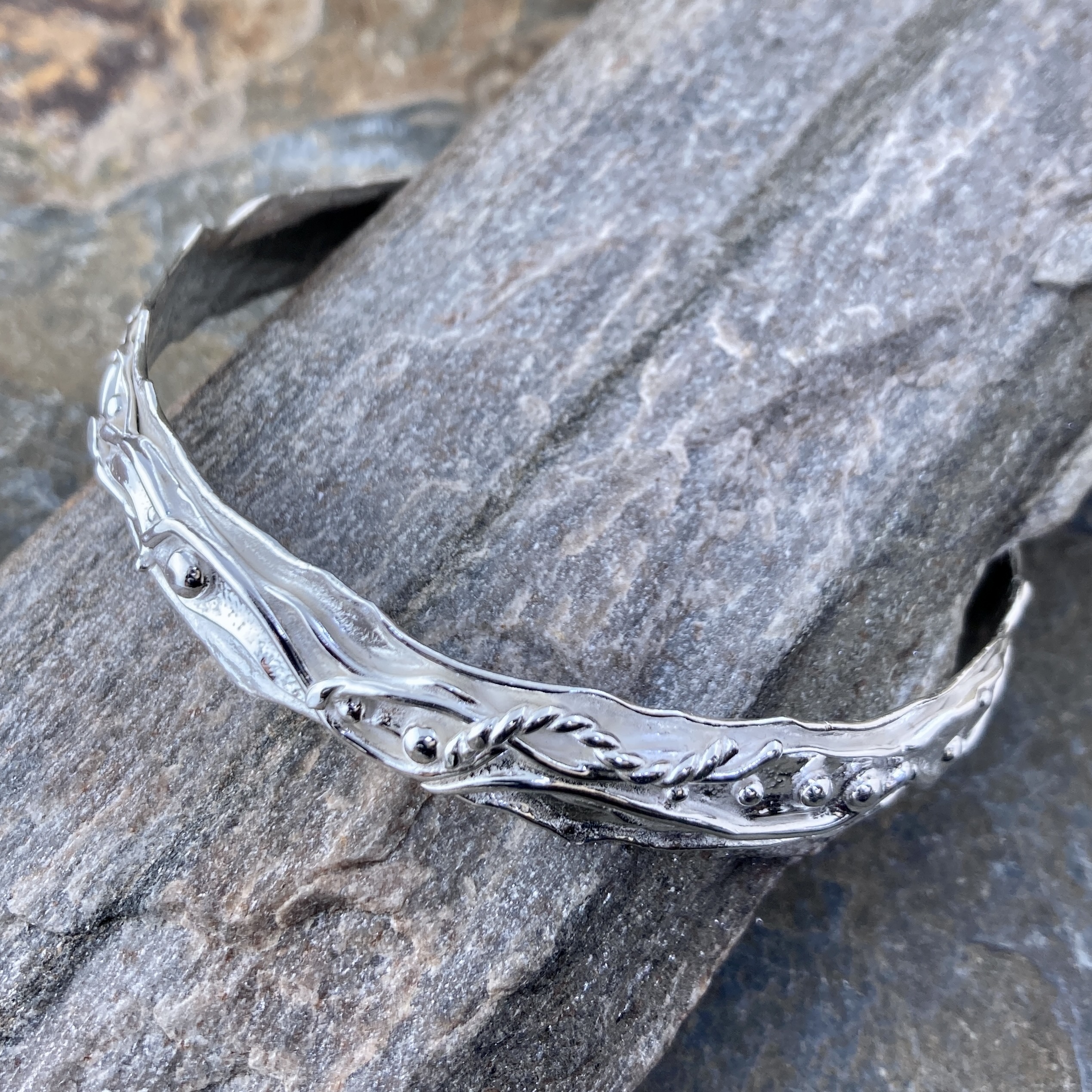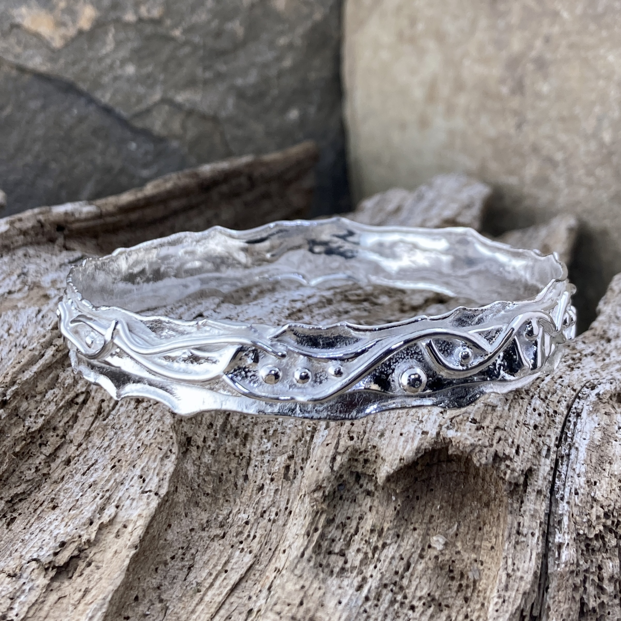I begin by melting the edges of the silver strip to create a soft, fluid outline. Then I add small fused silver waves and pebbles that shimmer as they catch the light.