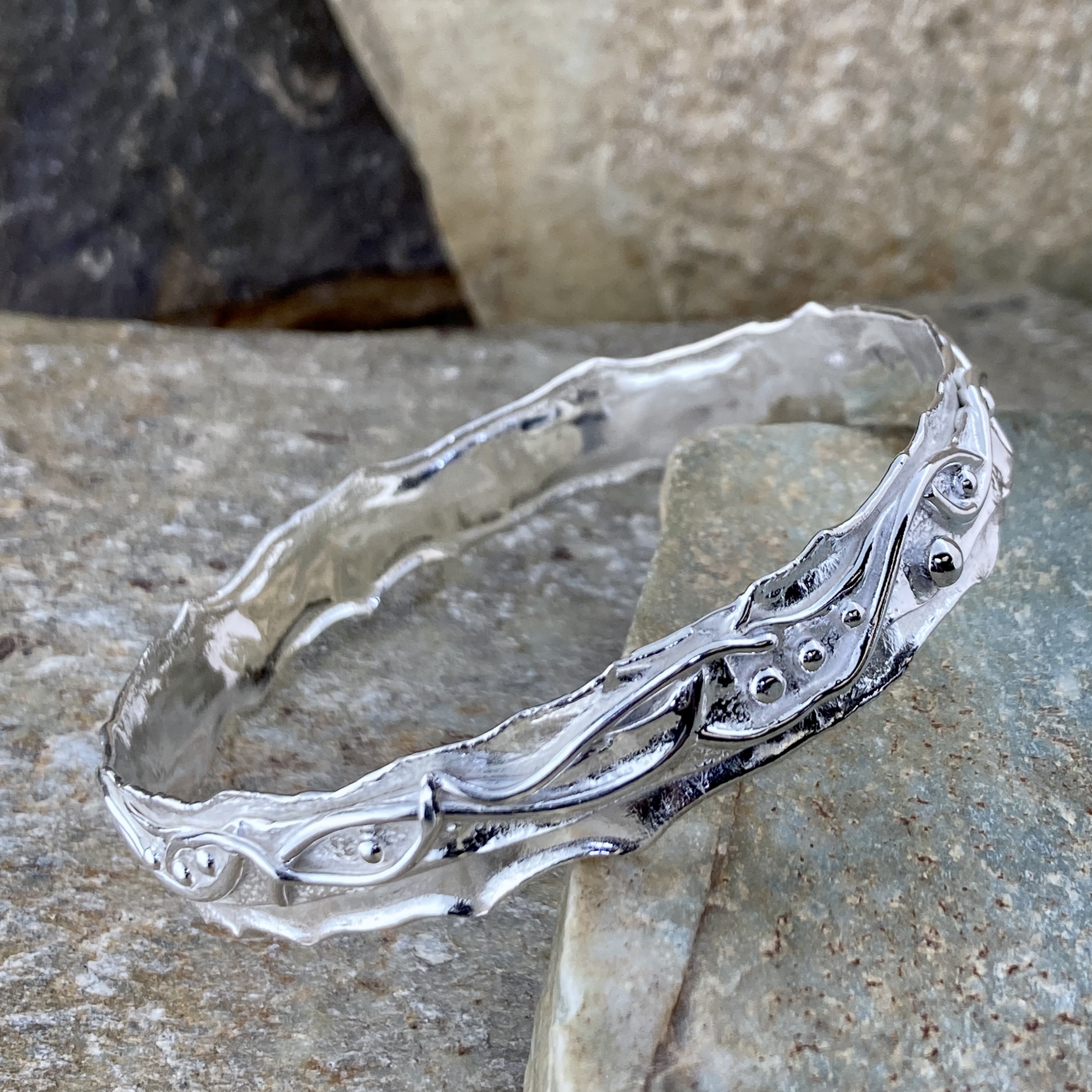 Each Argentium Silver Waves Bangle begins as a flat strip of metal. I fuse, texture, and form it entirely by hand — without solder. The high heat creates seamless joins and smooth edges that flow naturally around the wrist. After shaping, I polish it to a mirror finish that enhances the wave pattern and texture.