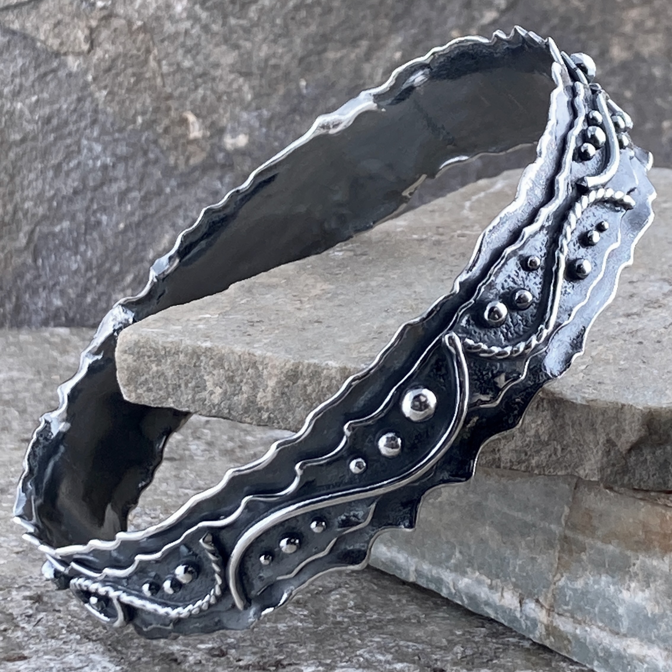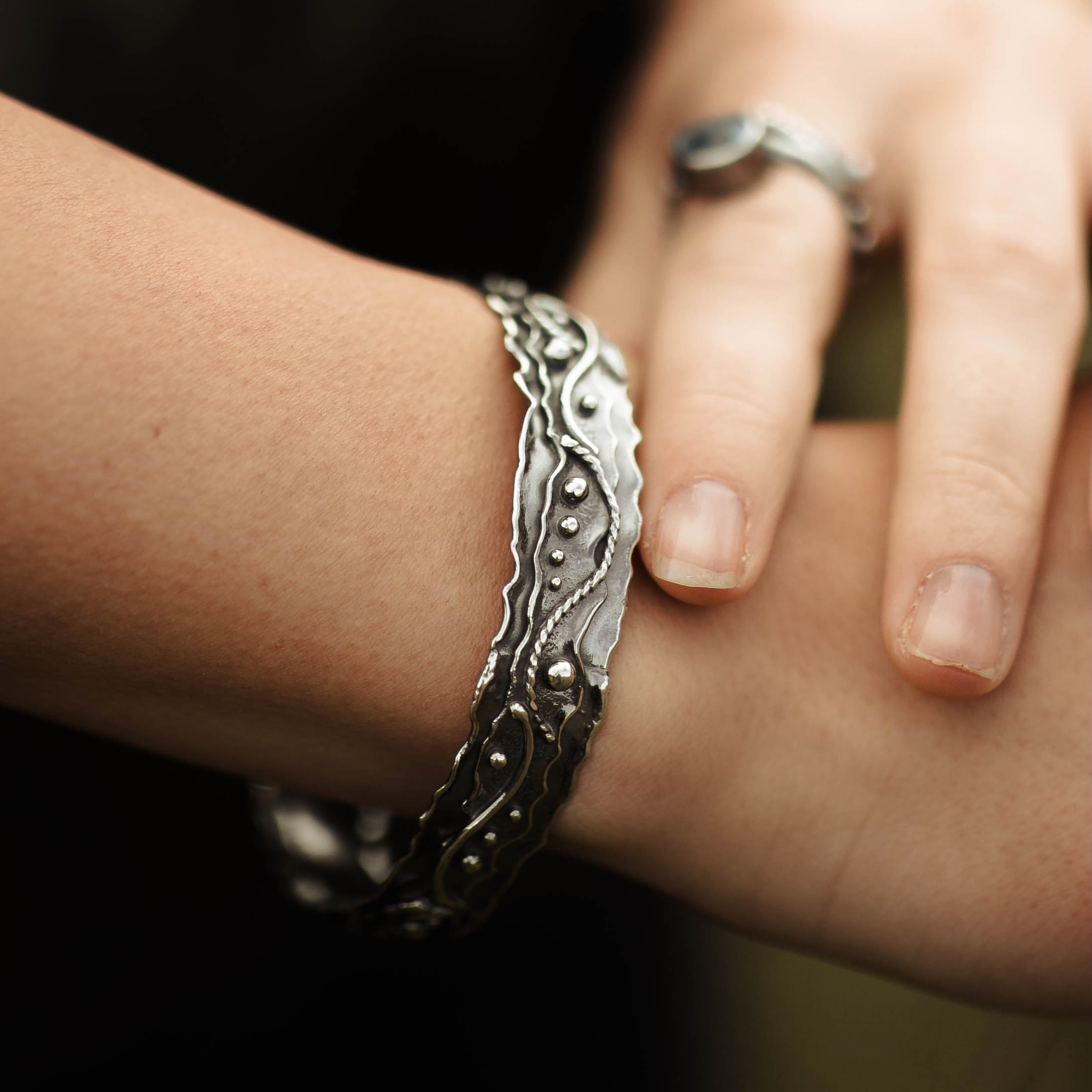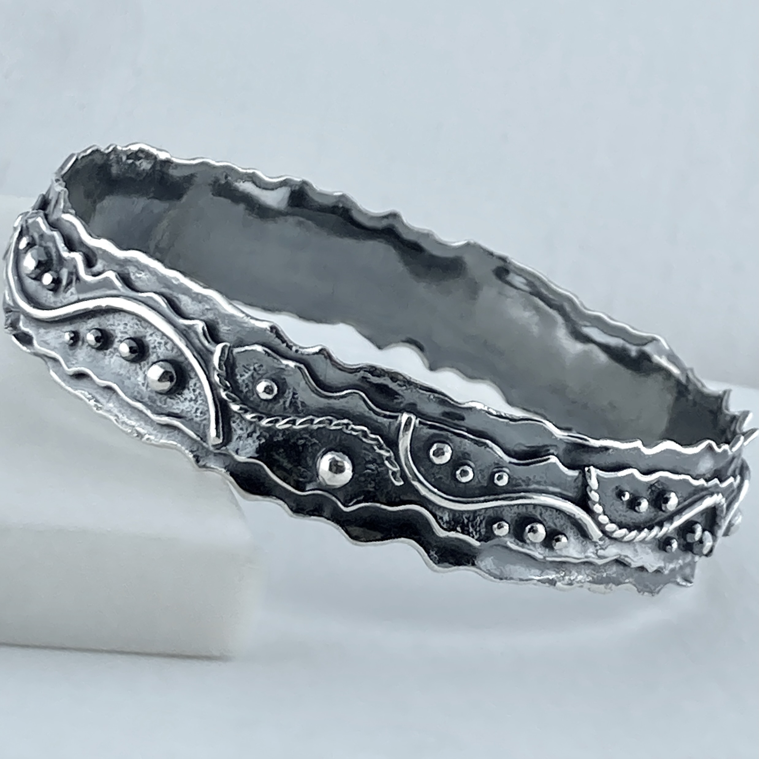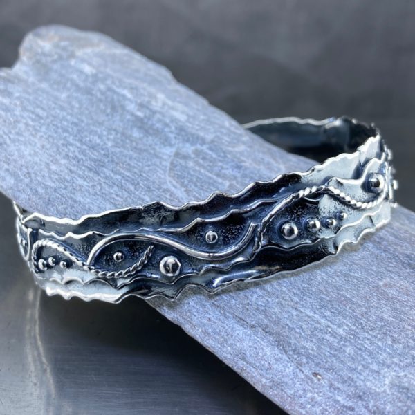 The Argentium Silver Waves Bangle Large Antique blends flowing movement with bold contrast. I melt the edges for a soft, fluid outline, add hand-fused waves and silver pebbles, and then build a double-layer structure for extra solidity and depth. After shaping the strip into a circle and fusing the ends, I apply the antique (black) finish so the ripples and granules stand out with clear definition.