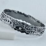 This Water design bangle shows motion and balance. First, I cut a wide strip of Argentium, melt the edges, and texture the surface. Next, I prepare a thinner strip, melt its edges, and fuse it on top to create the double layer. While the metal remains flat, I place the waves and pebbles to catch light and shadow. Finally, I form the bangle and fuse the join to keep the circle seamless, strong, and comfortable.