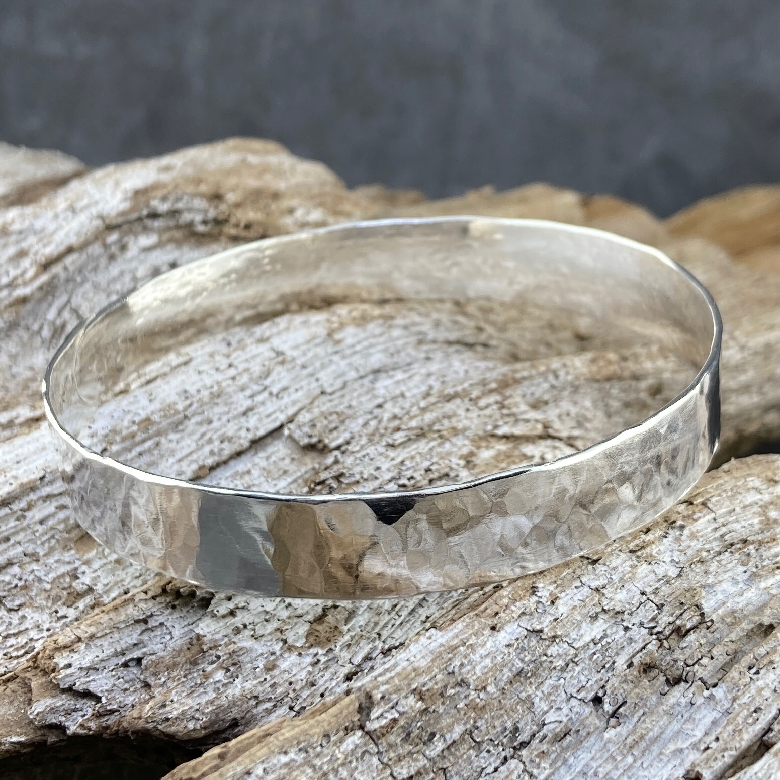 First, we cut and forge wide Argentium silver wire to the correct size. Next, we hammer the surface to create texture and depth. Then, we smooth the edges and form the metal into a true oval. After that, we harden the silver for strength and lasting shape. Finally, we polish the surface until the hammered pattern shines. As a result, each bangle shows its own handmade rhythm and reflection of light.
