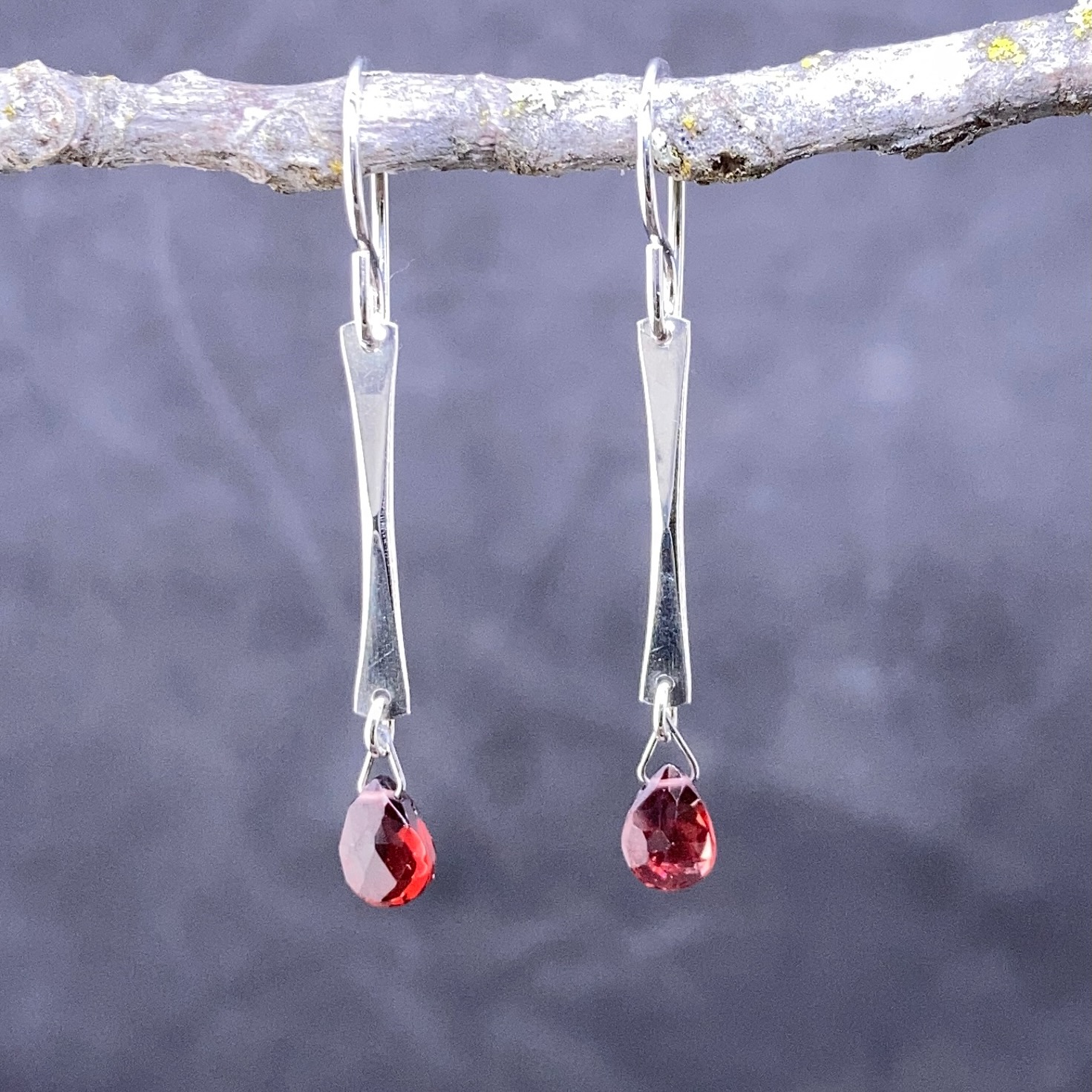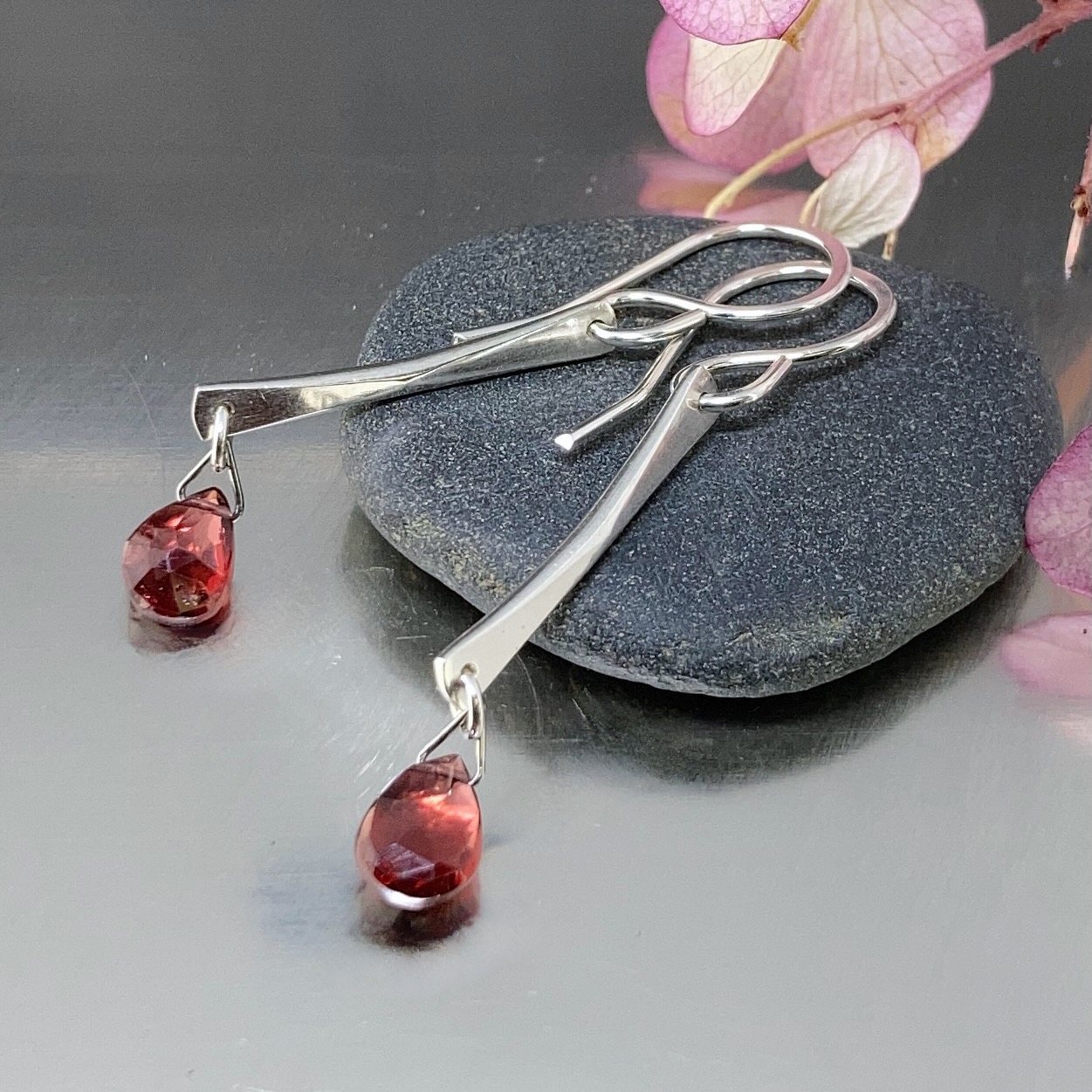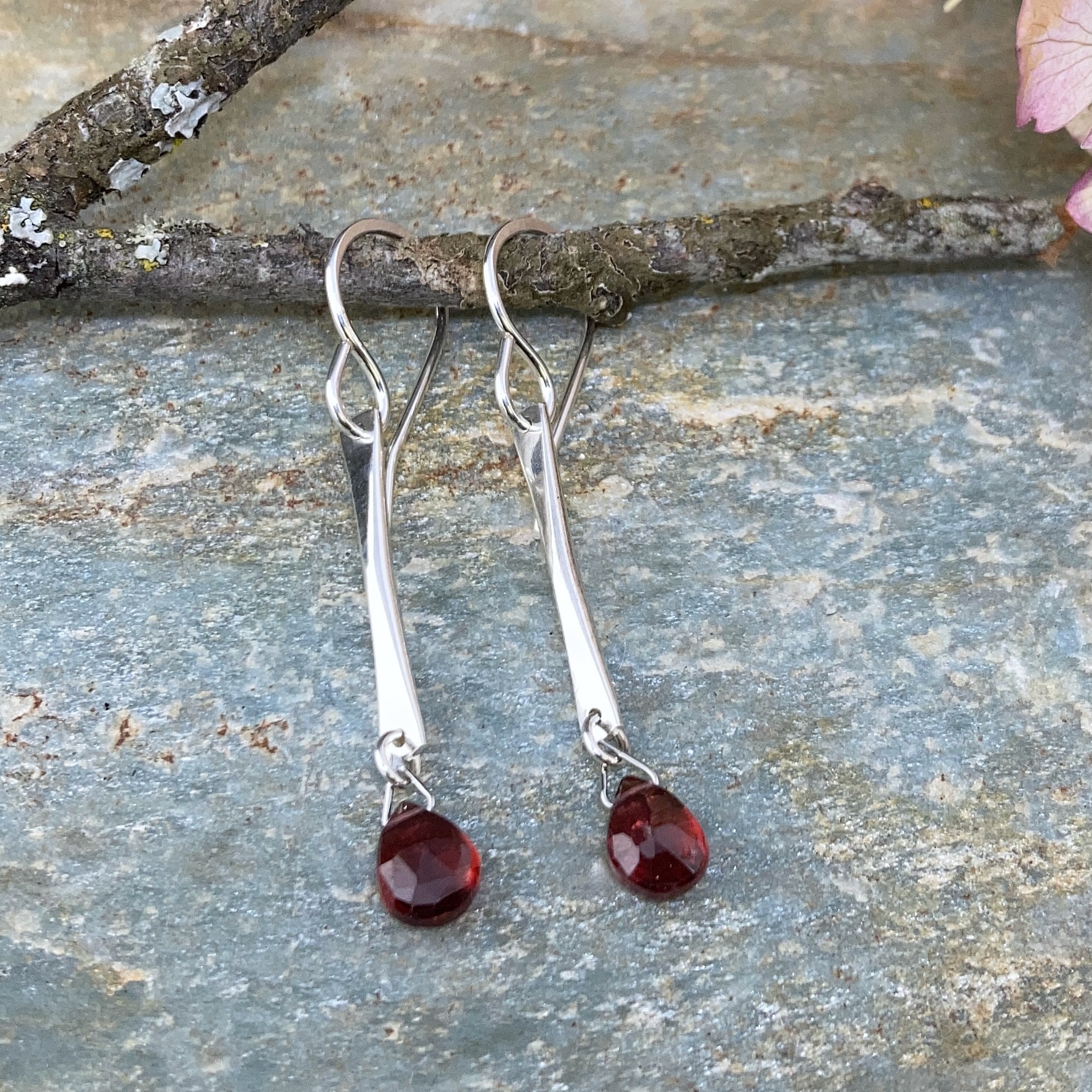 An Argentium silver bar hammered in a simple 2 angles design. With Gemstone teardrops suspended from the sparkling silver.
