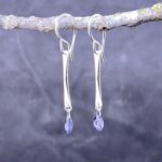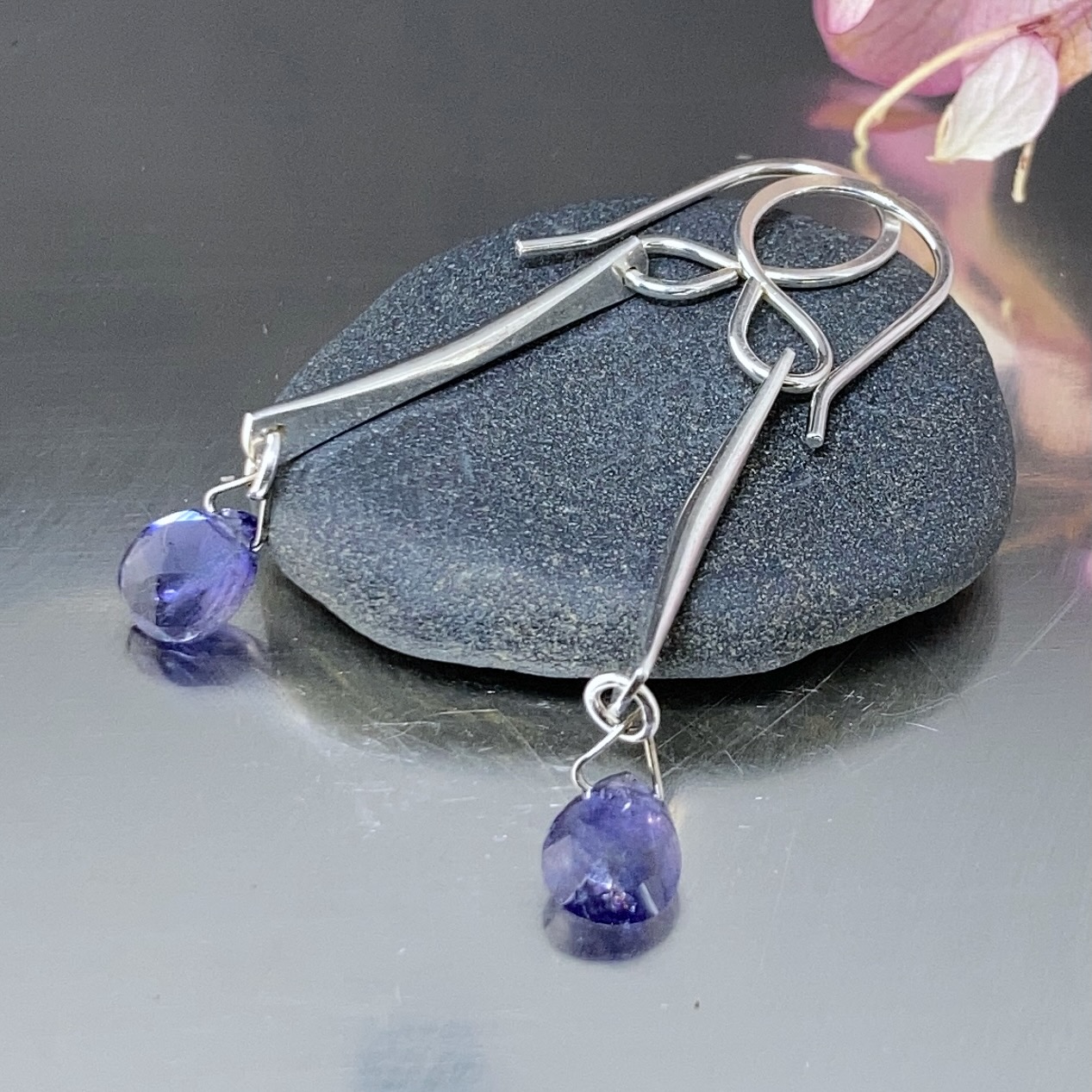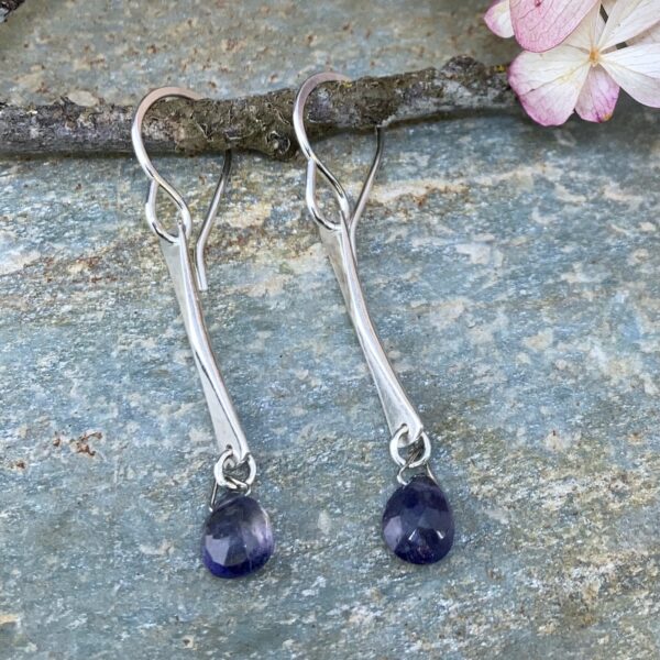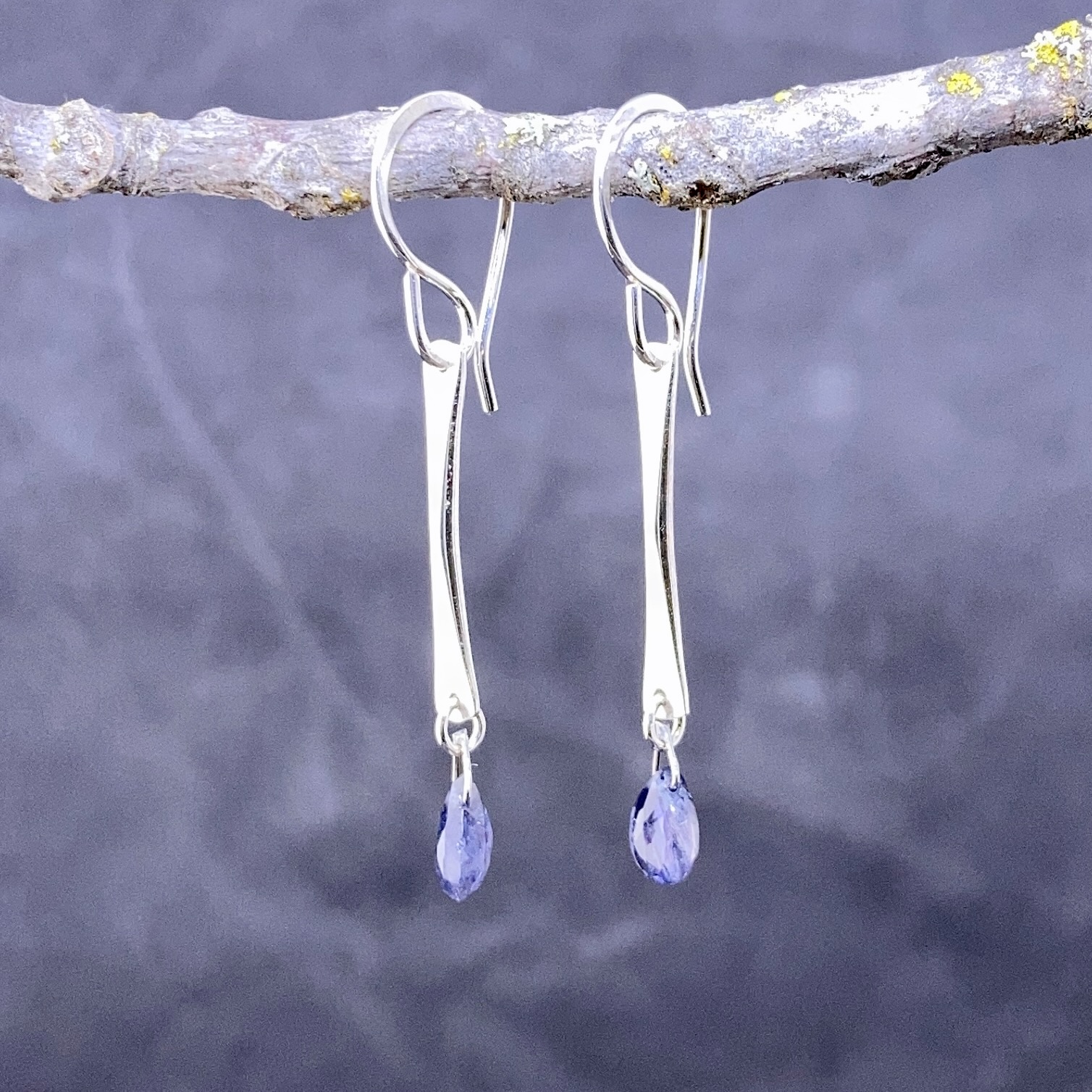 An Argentium silver bar hammered in a simple 2 angles design. With Gemstone teardrops suspended from the sparkling silver.