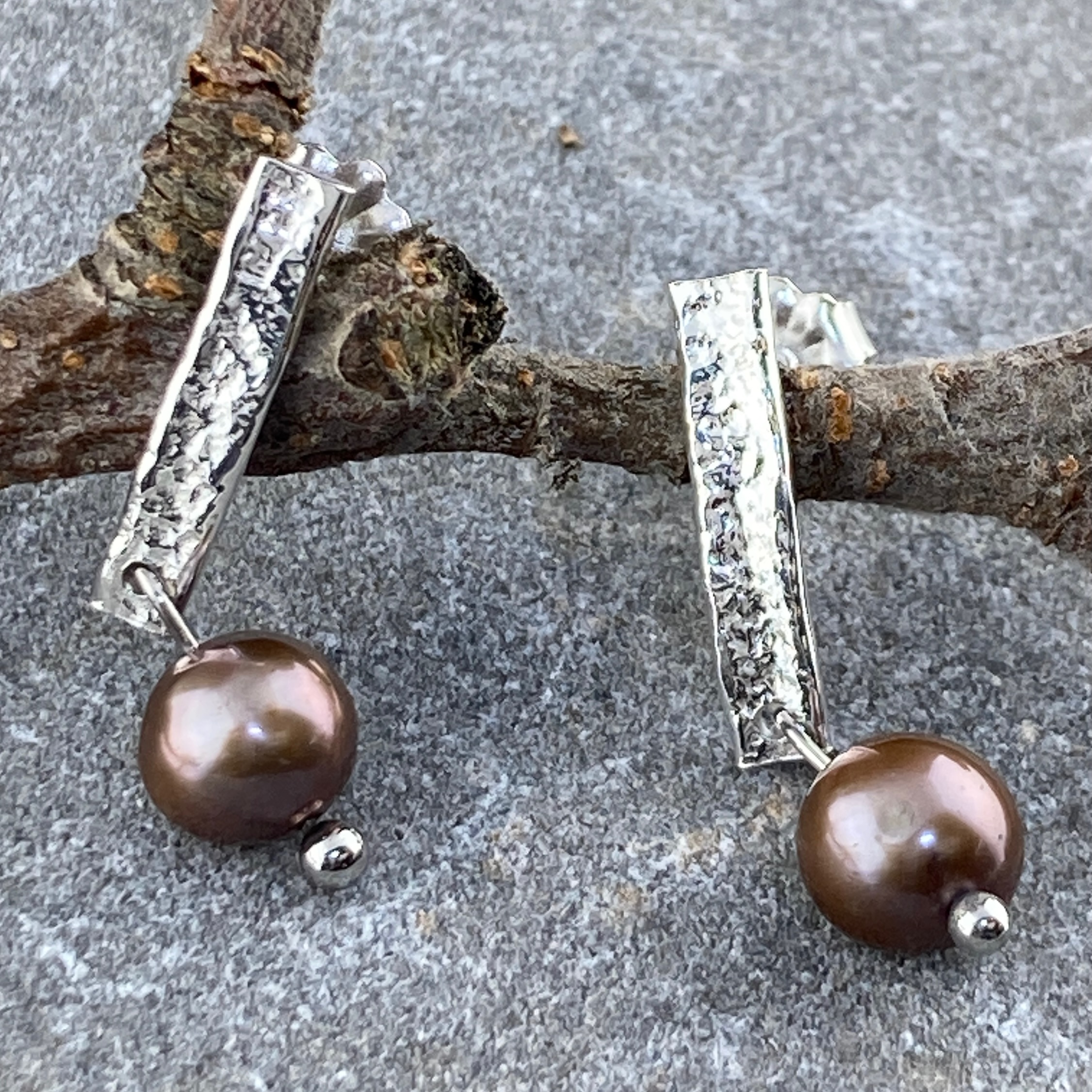 bar with pearl (brown) – post.  Argentium silver bar with a lace texture.  These earrings feature a brown coloured genuine pearl.
