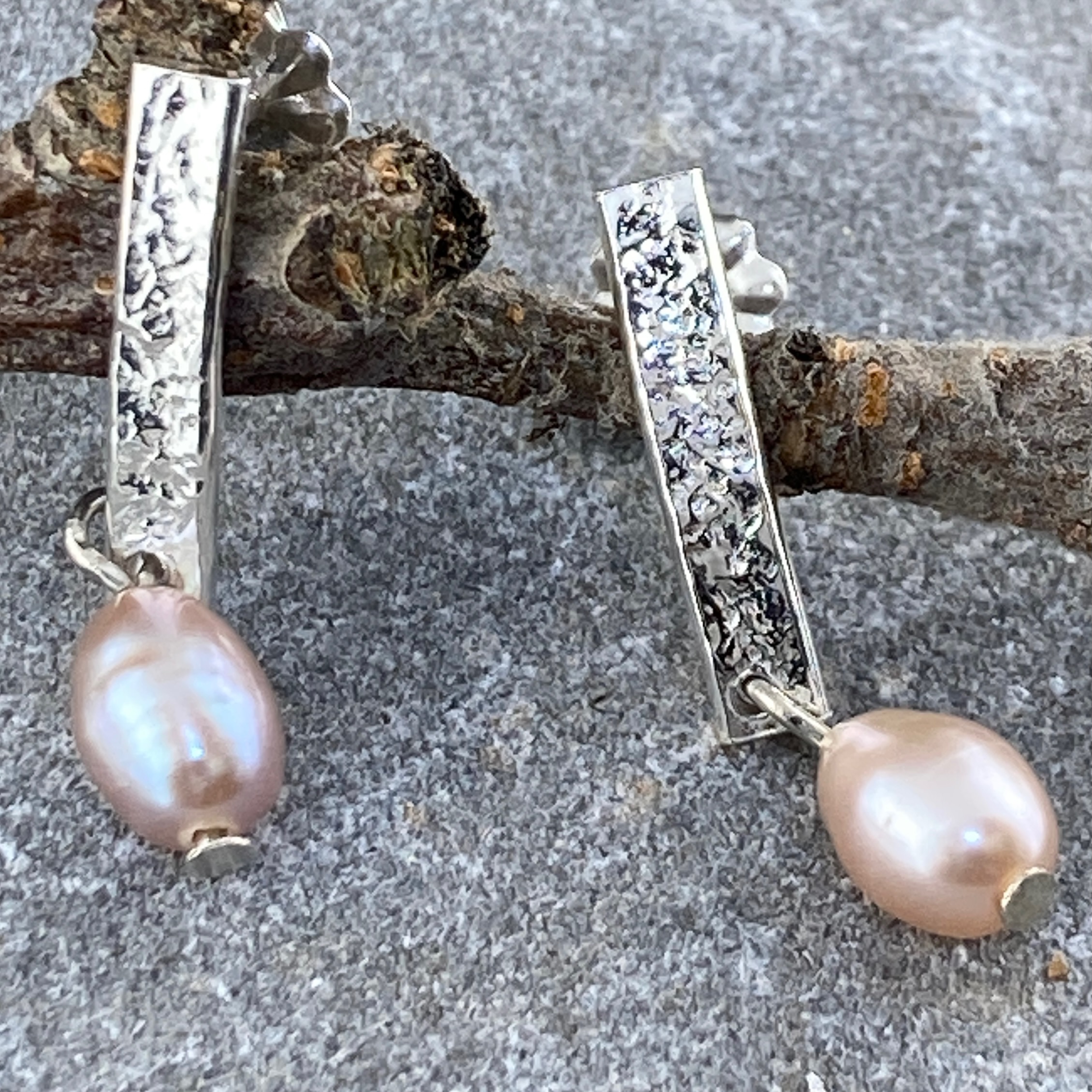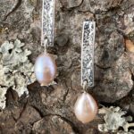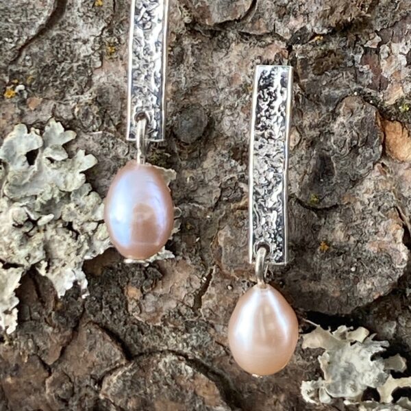 Argentium silver bar with a lace texture. Â Accented with a genuine pink pearl drop.
