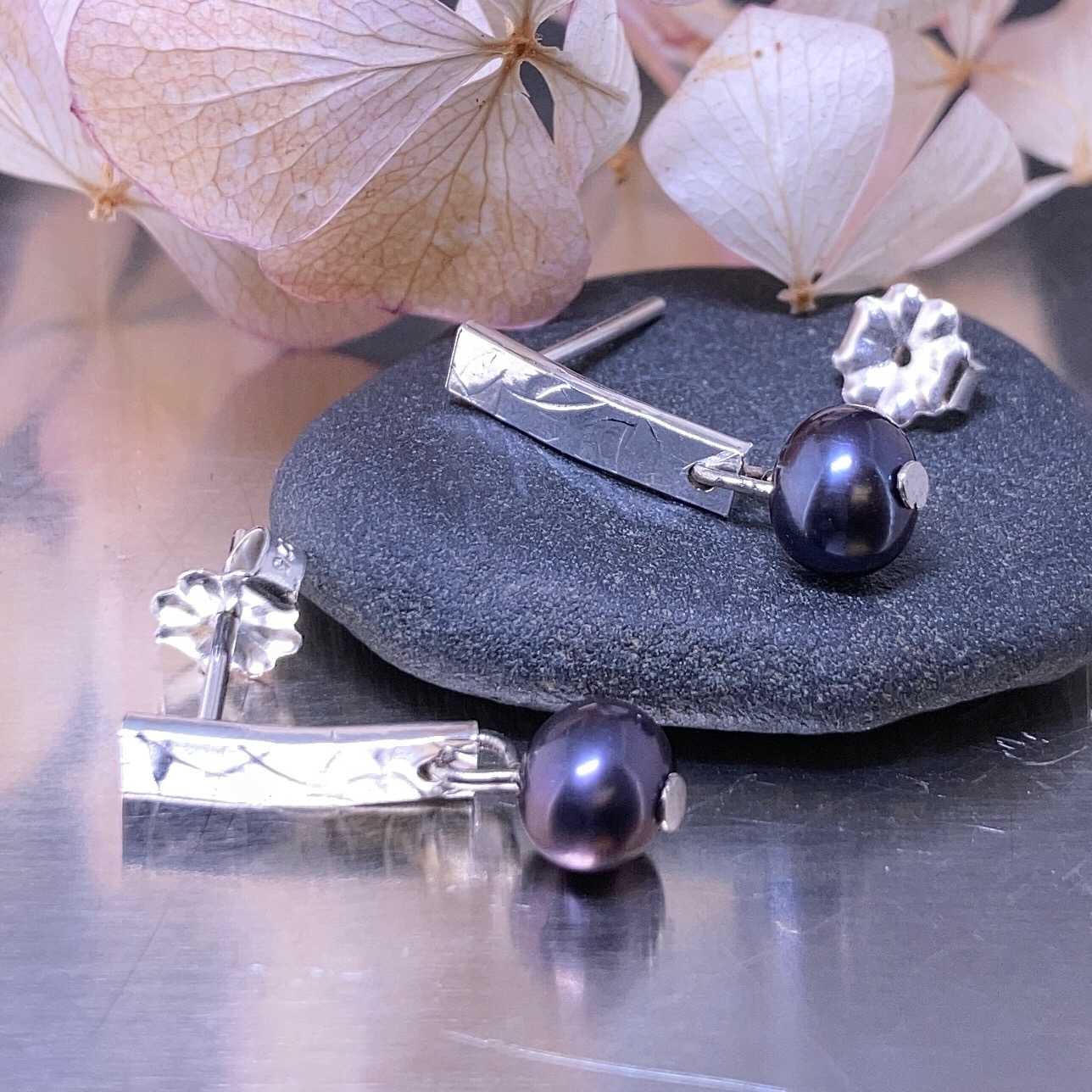 Argentium silver bar with a hand hammered texture. Post closure with a butterfly. And a purple fresh water pearl drop.