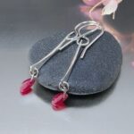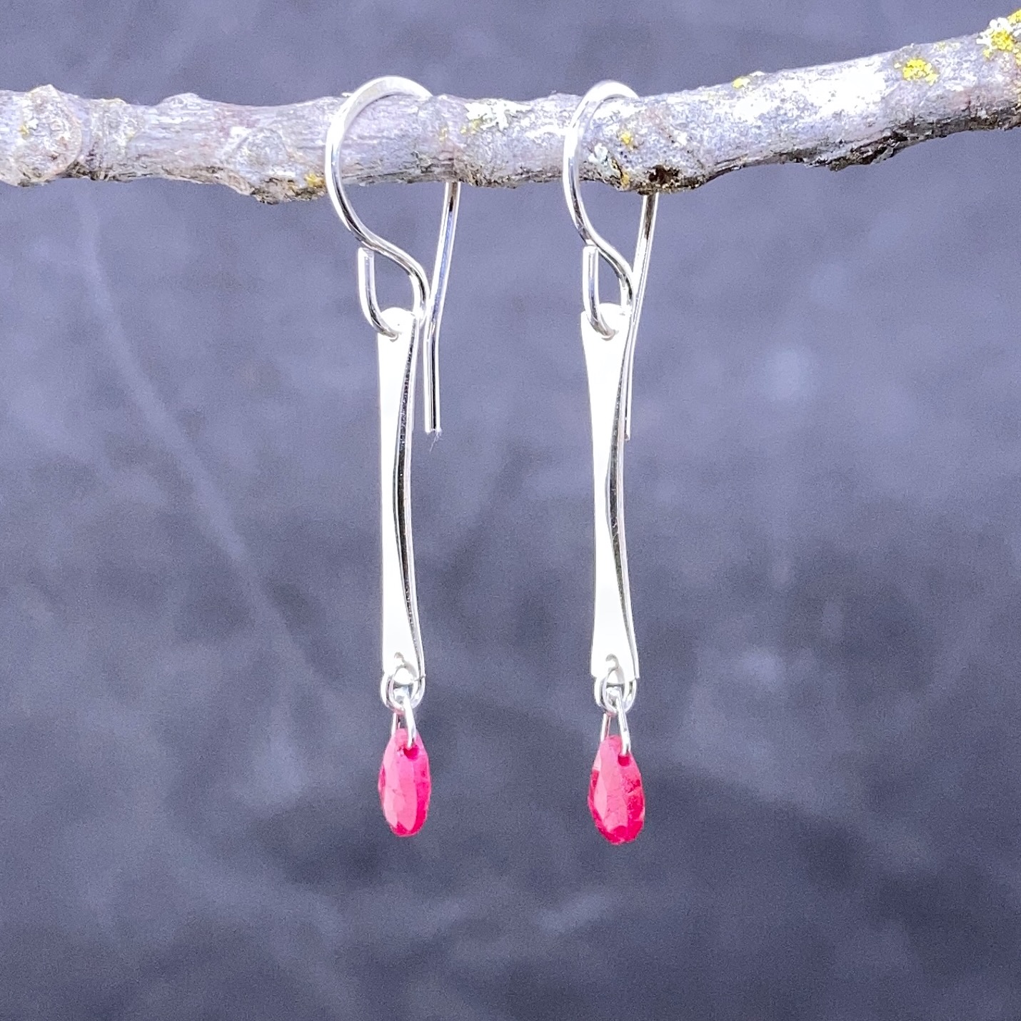An Argentium silver bar hammered in a simple 2 angles design.  With Gemstone teardrops suspended, and on a hand-made ear wire.
