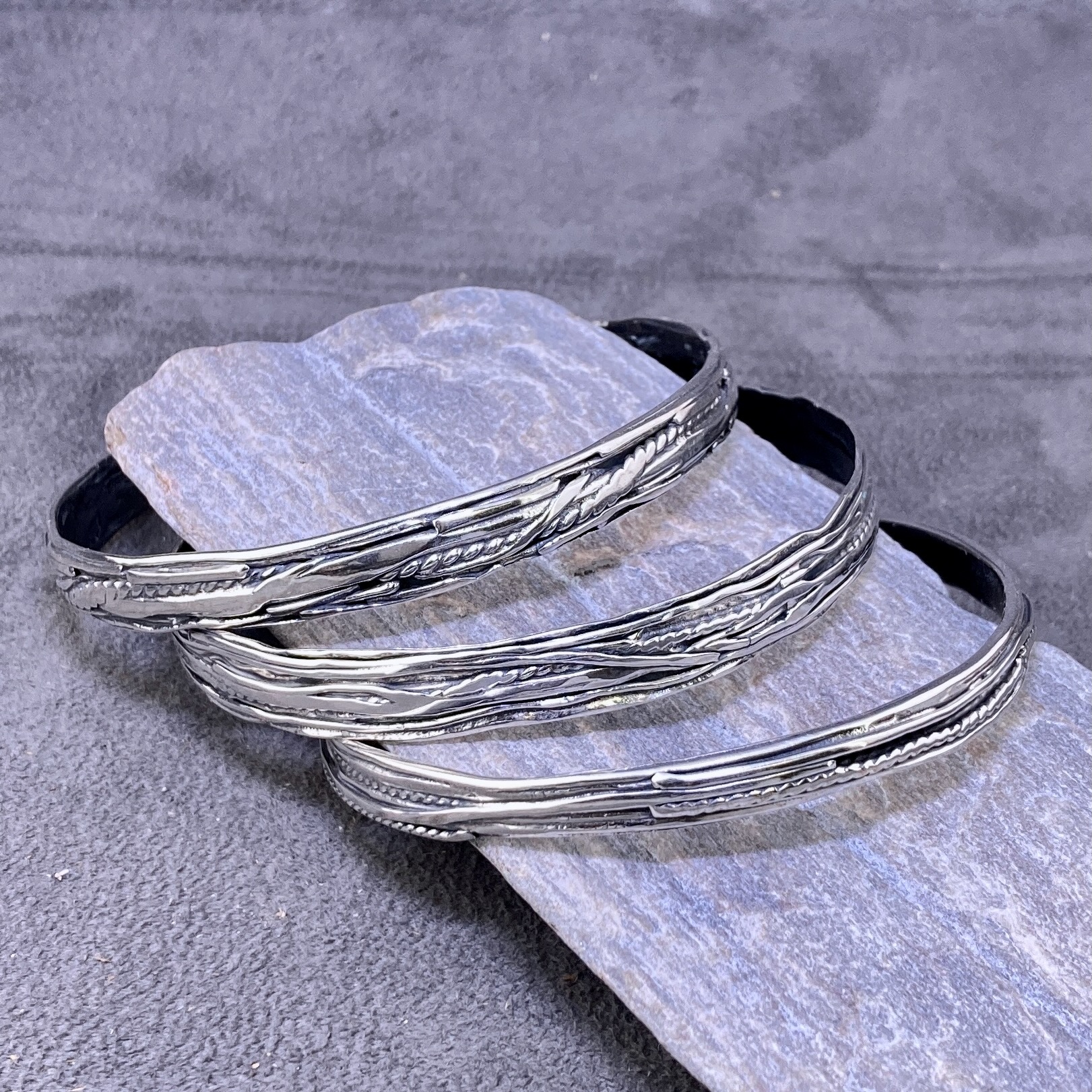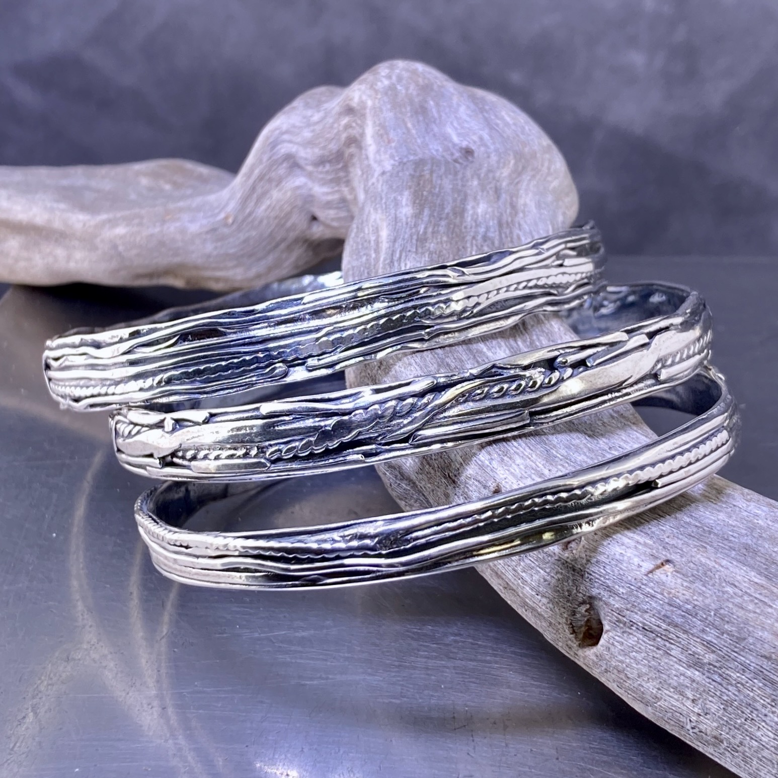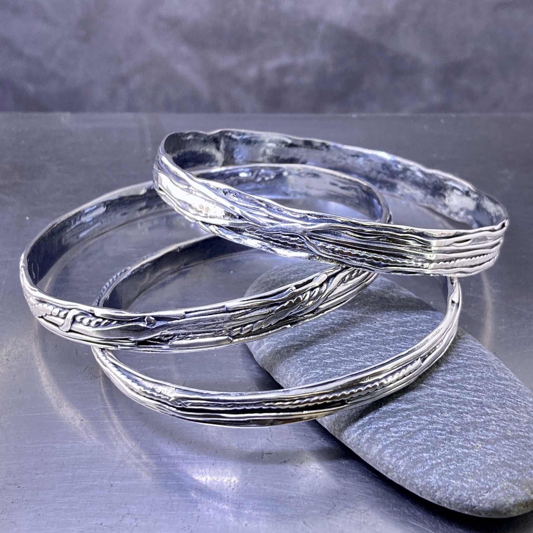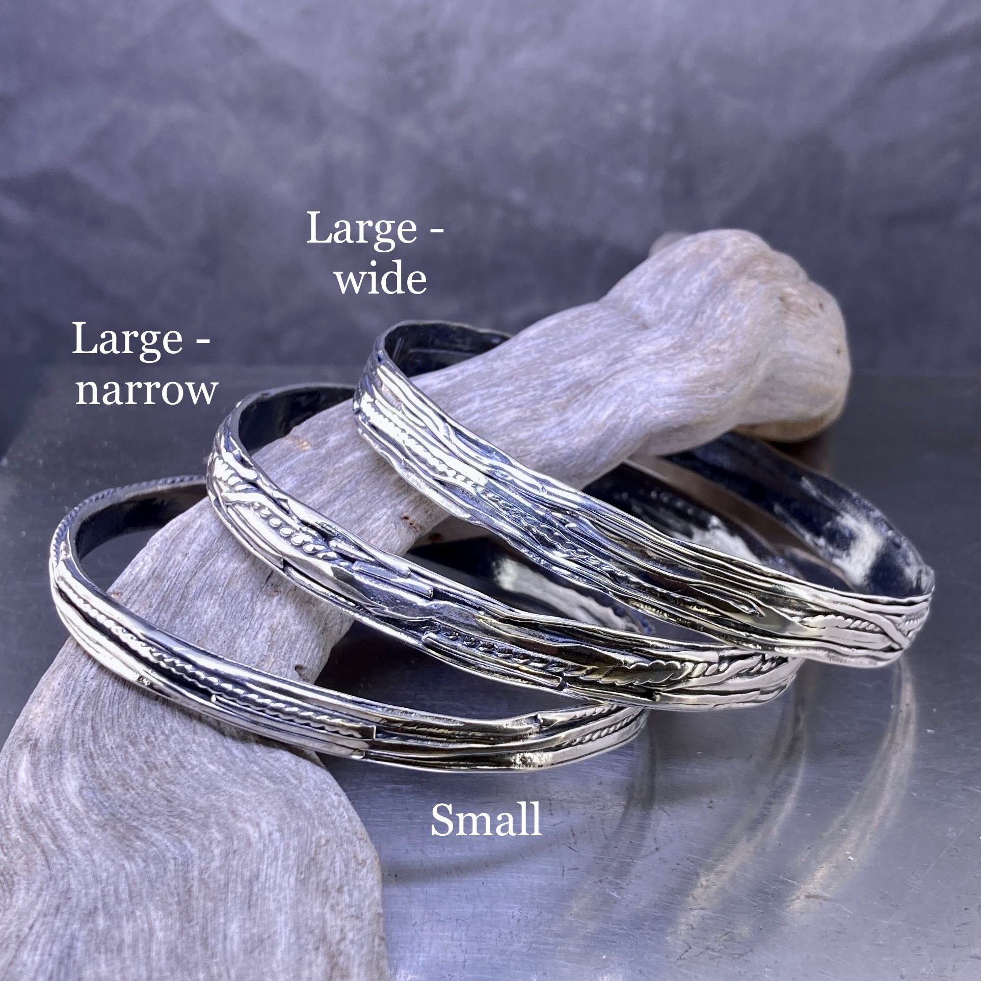 Handcrafted in solid Argentium silver, this bangle carries a bark-like surface with a deep antique patina. The oxidised finish highlights every ridge and recess, creating striking contrast and earthy elegance. Each bracelet is shaped into a true circle, polished on the edges, and work-hardened for durability. Because each is individually handmade in our BC studio, subtle differences in texture make every piece unique.