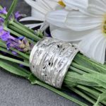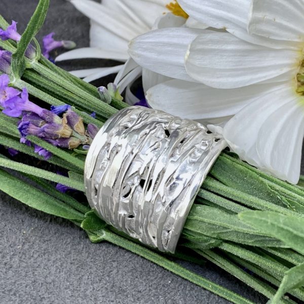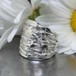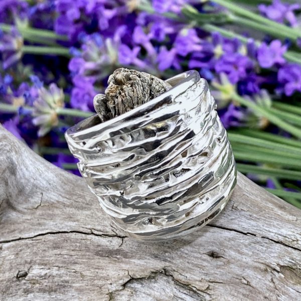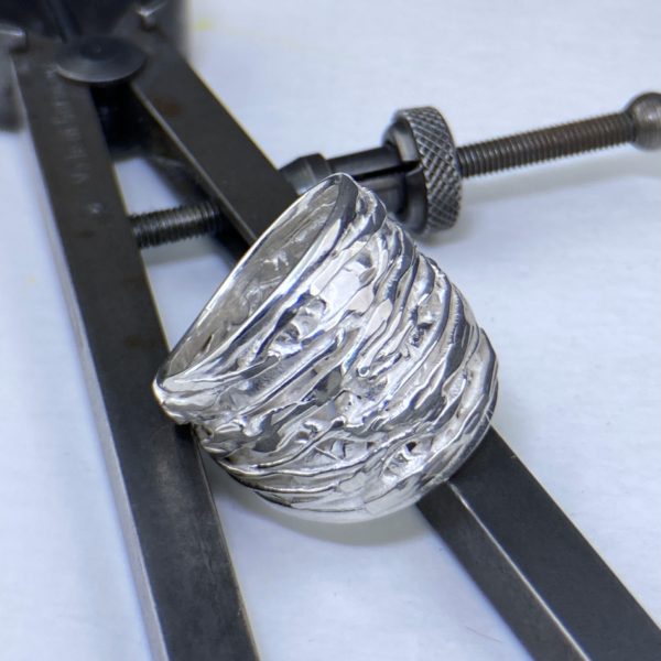 bark design – size 10.5 – horizontal.  This is a solid Argentium silver band – hand made each time.  It is layers of silver laid over top of each other and fused.  More and more silver is layered until a pattern of silver Bark emerges.
