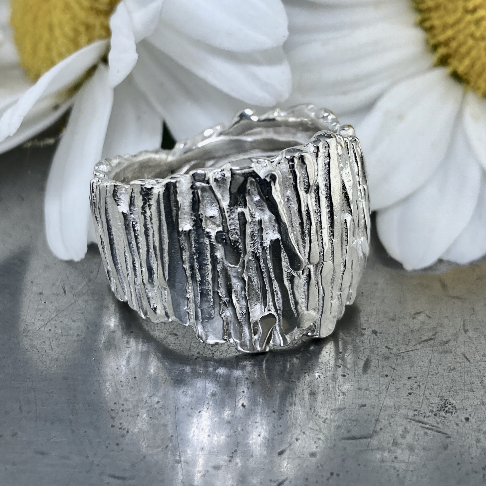 This ring grows through layers and heat. I build the surface by layering Argentium silver and fusing each section in place. Then I continue shaping and refining until a vertical bark pattern emerges. The process stays direct and intentional, guided by texture and balance.