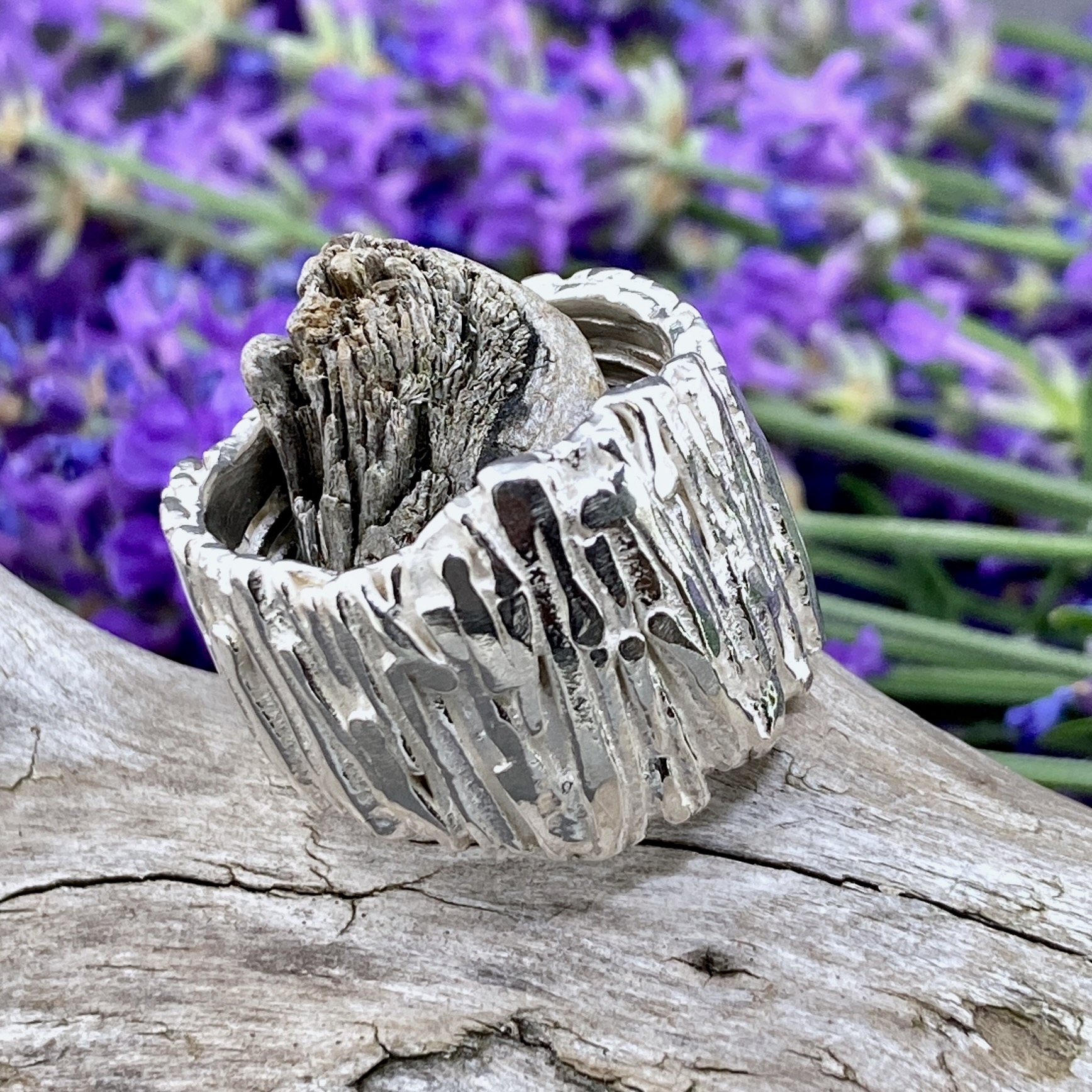 I layer and fuse silver to build the bark surface. Next, I hammer and shape the band to refine the form. Finally, I heat-treat and polish the ring to completion.