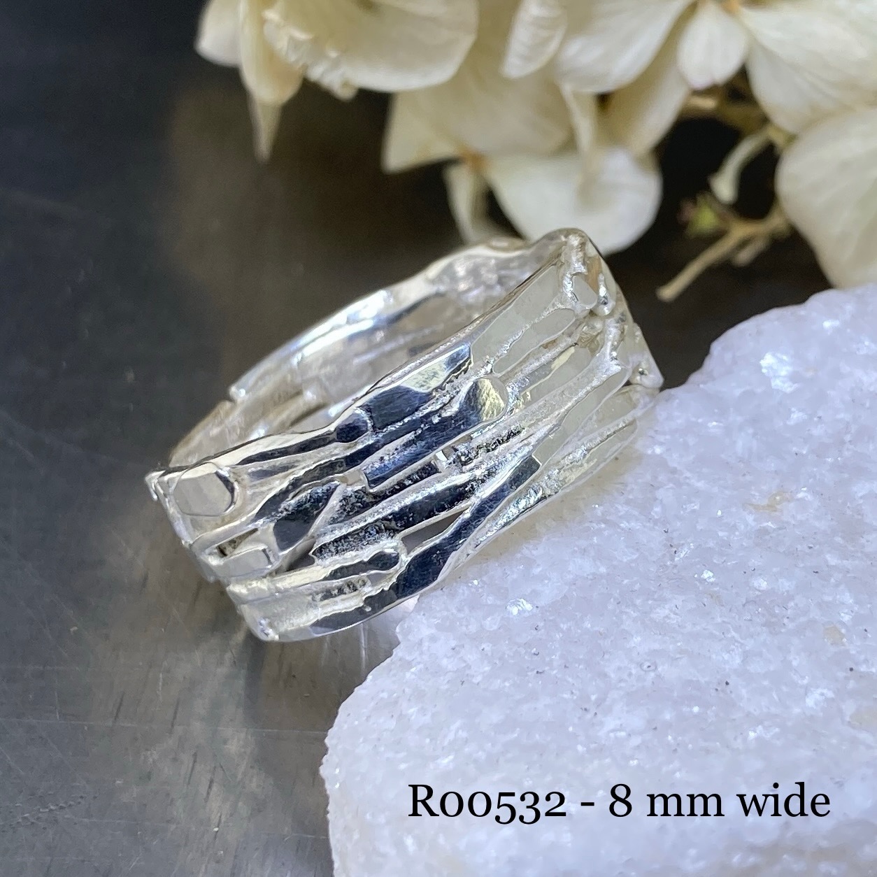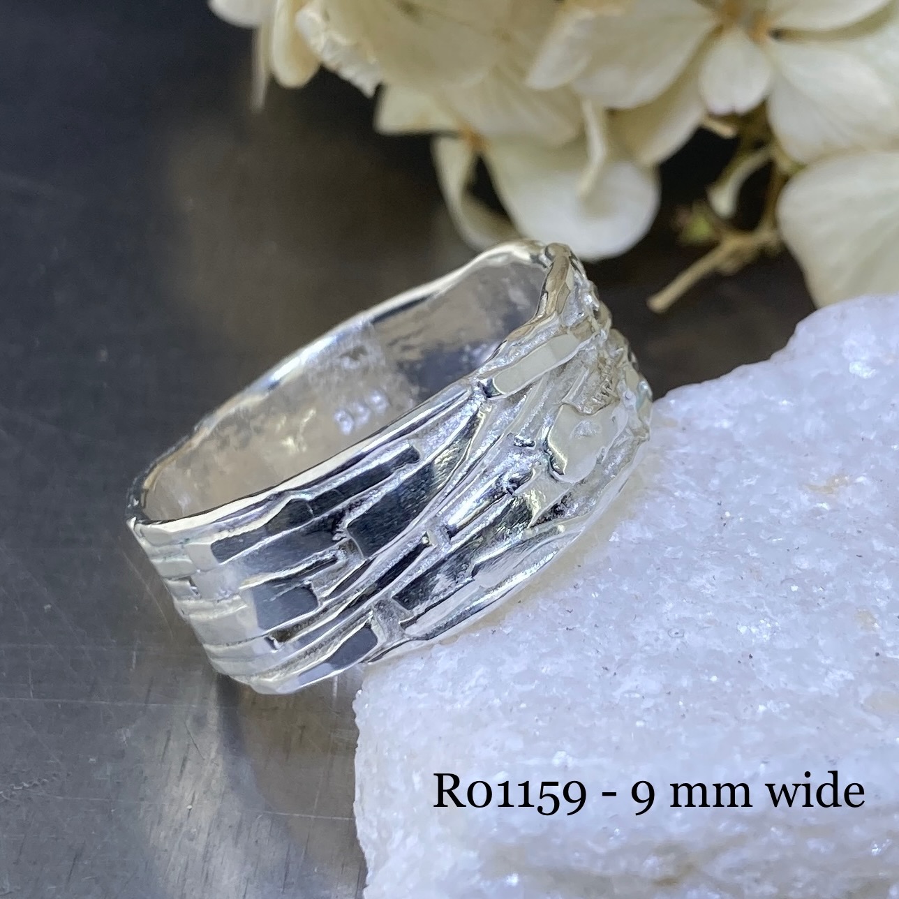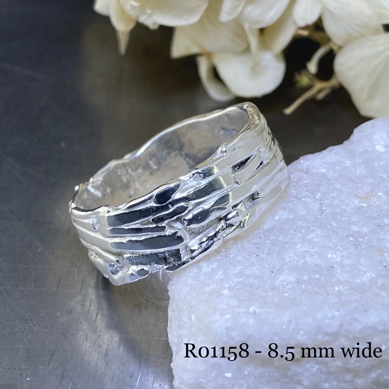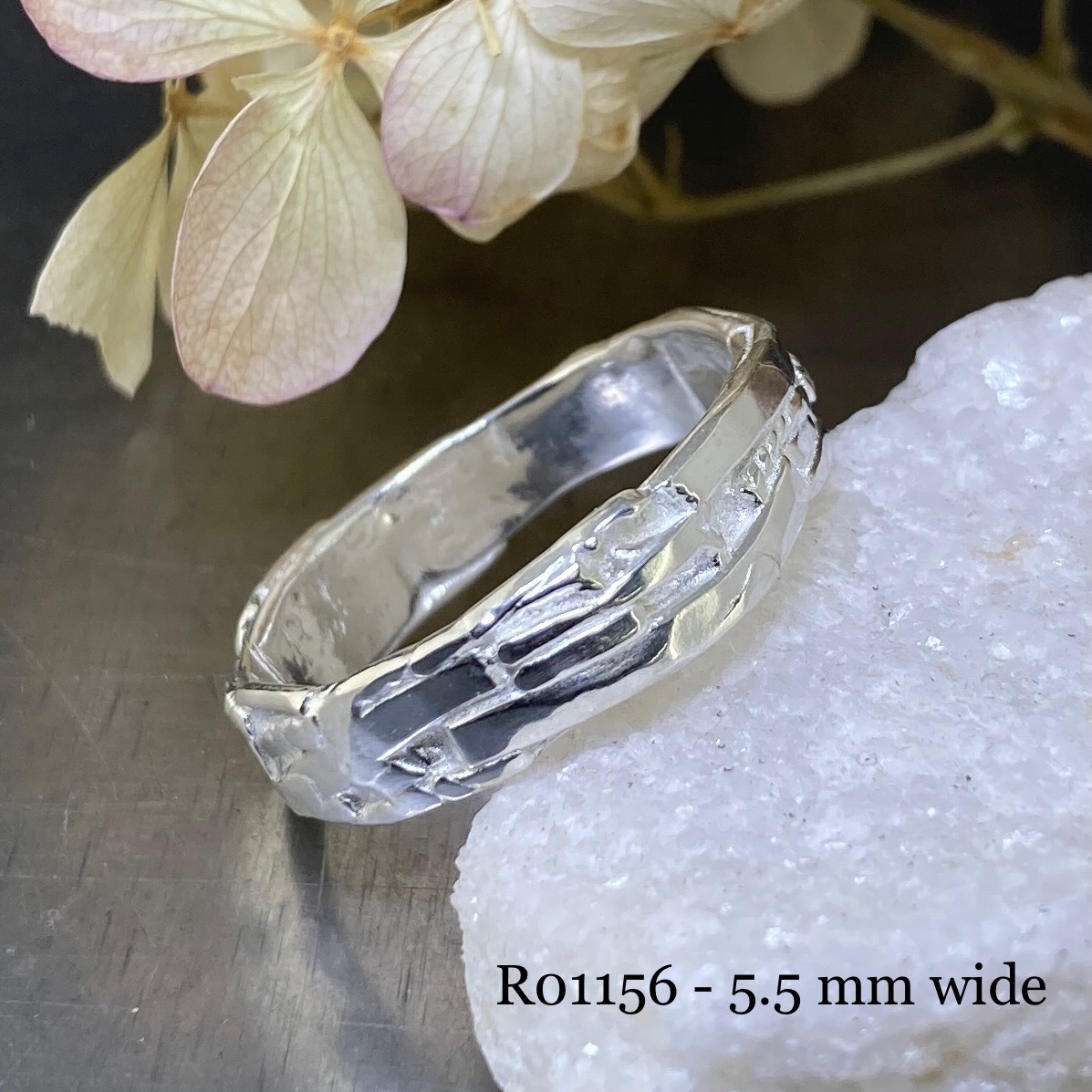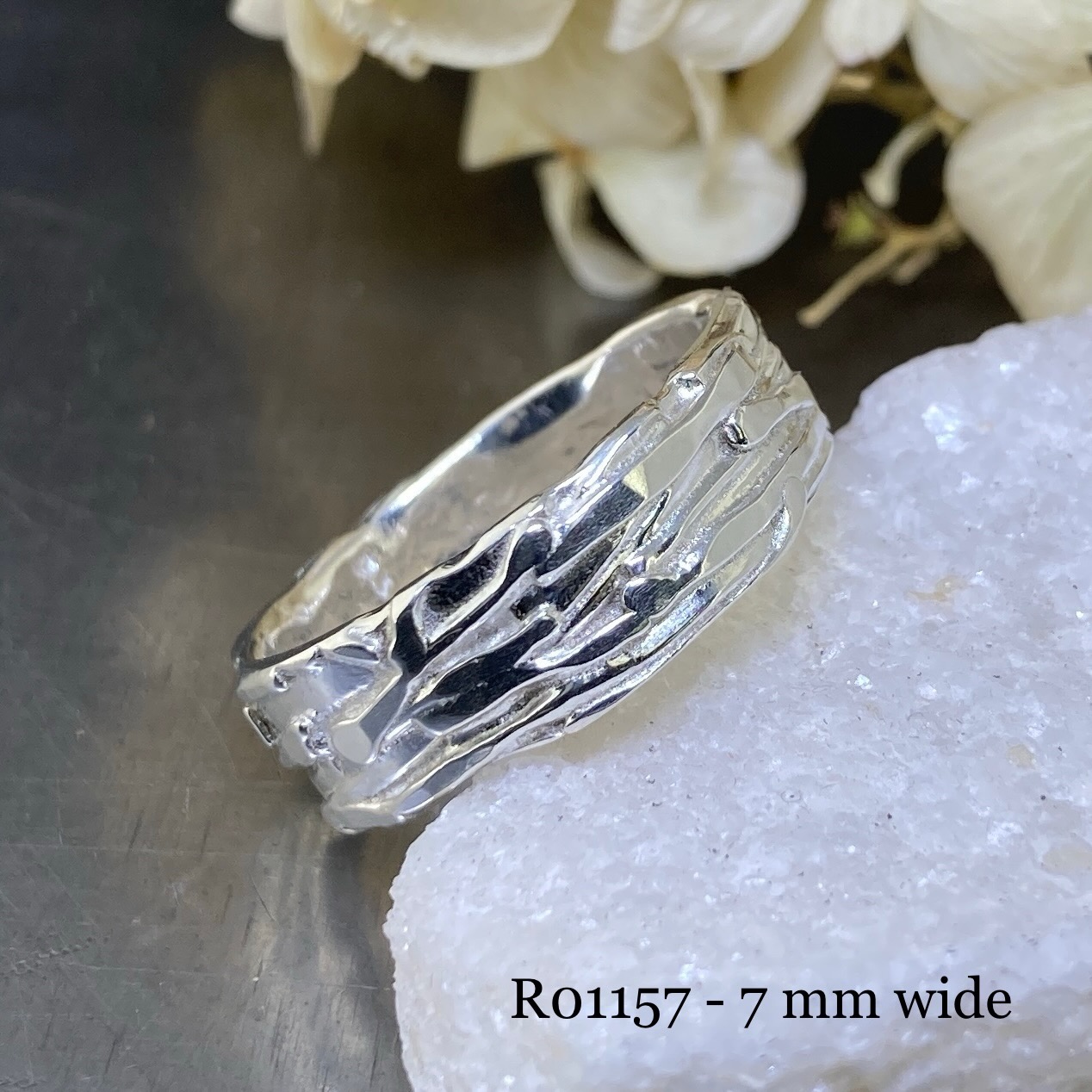 This is a solid Argentium silver band – hand made each time. It is layers of Argentium silver laid over top of each other and fused. More and more silver is layered until a pattern of silver Bark emerges. Very beautiful – great for casual – great for Men and Women.