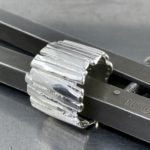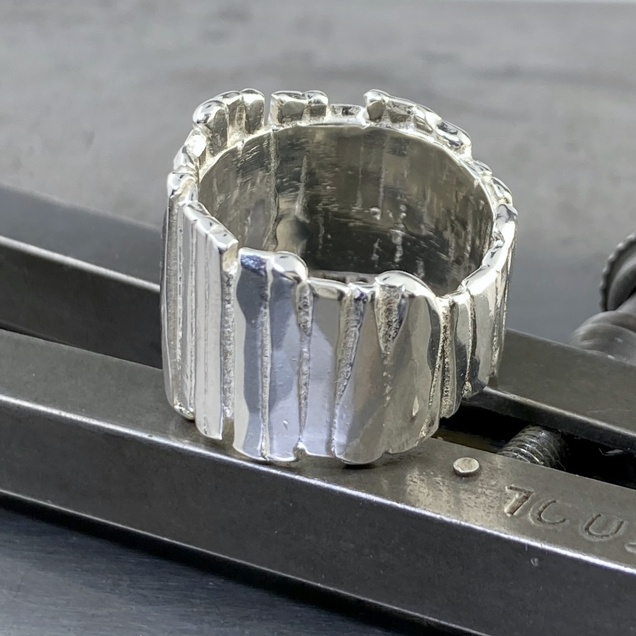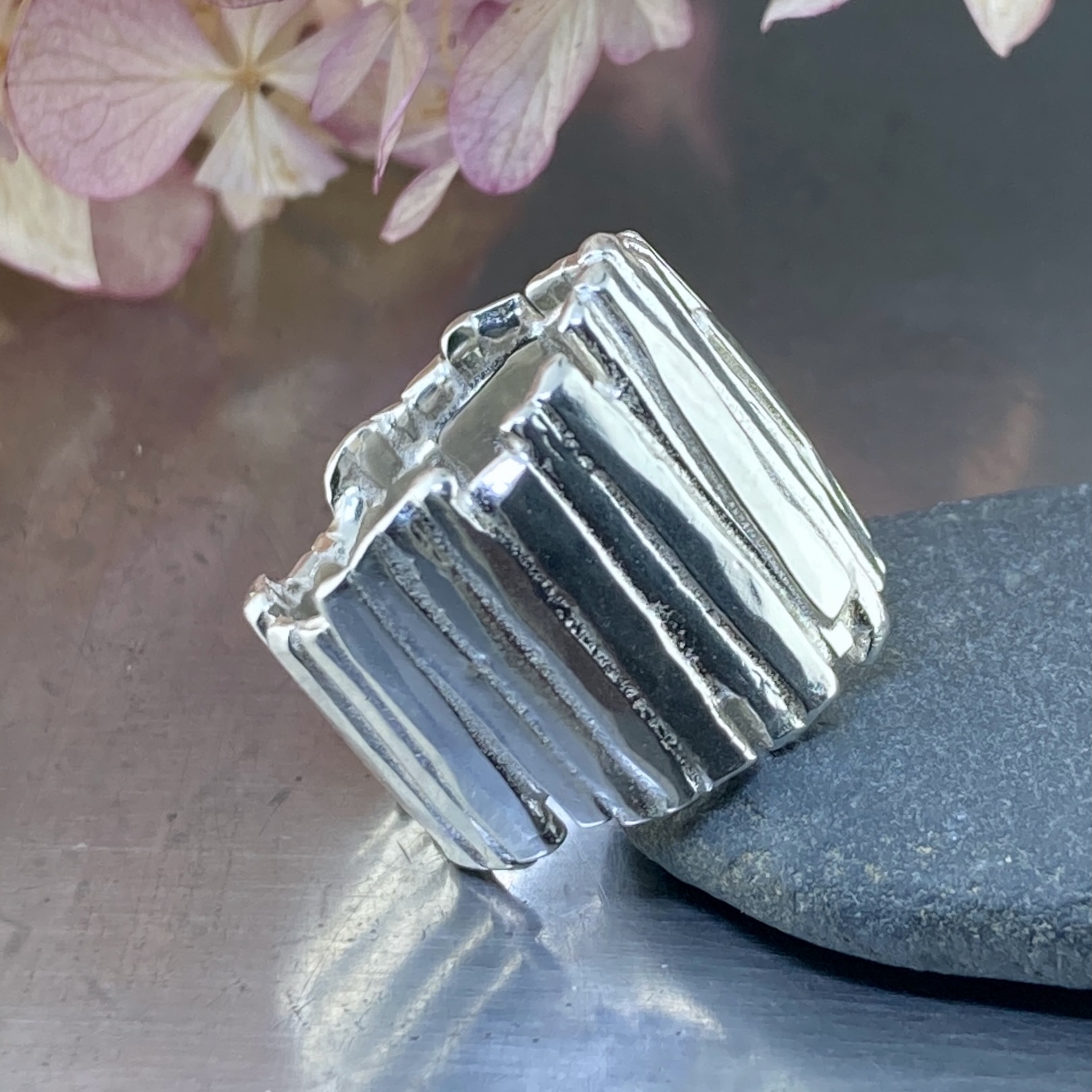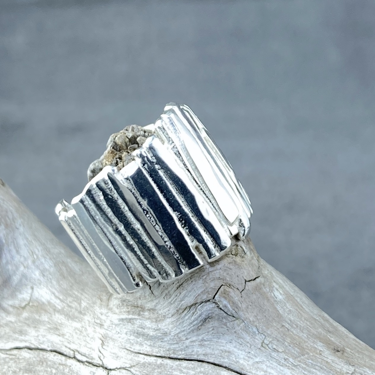 A vertical strip of silver bark – for this solid Argentium silver Bark design ring.