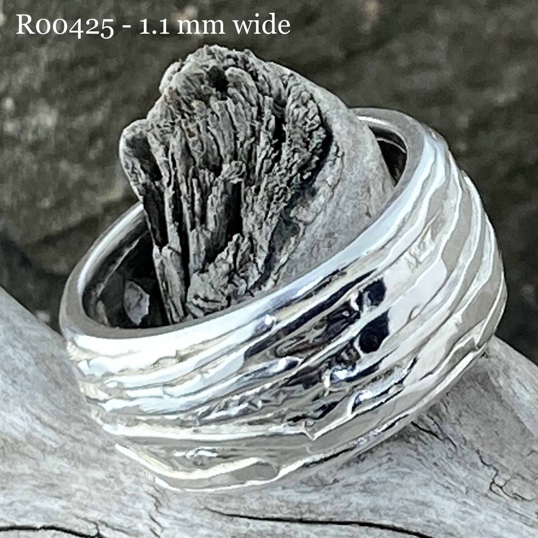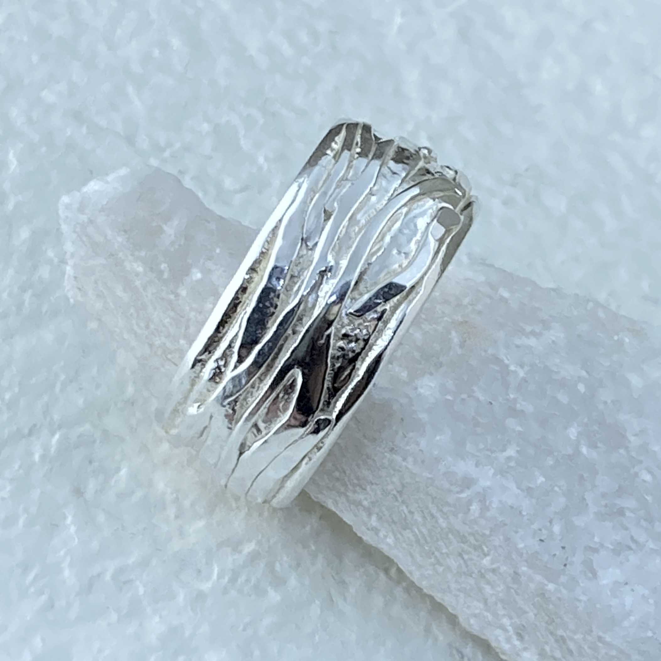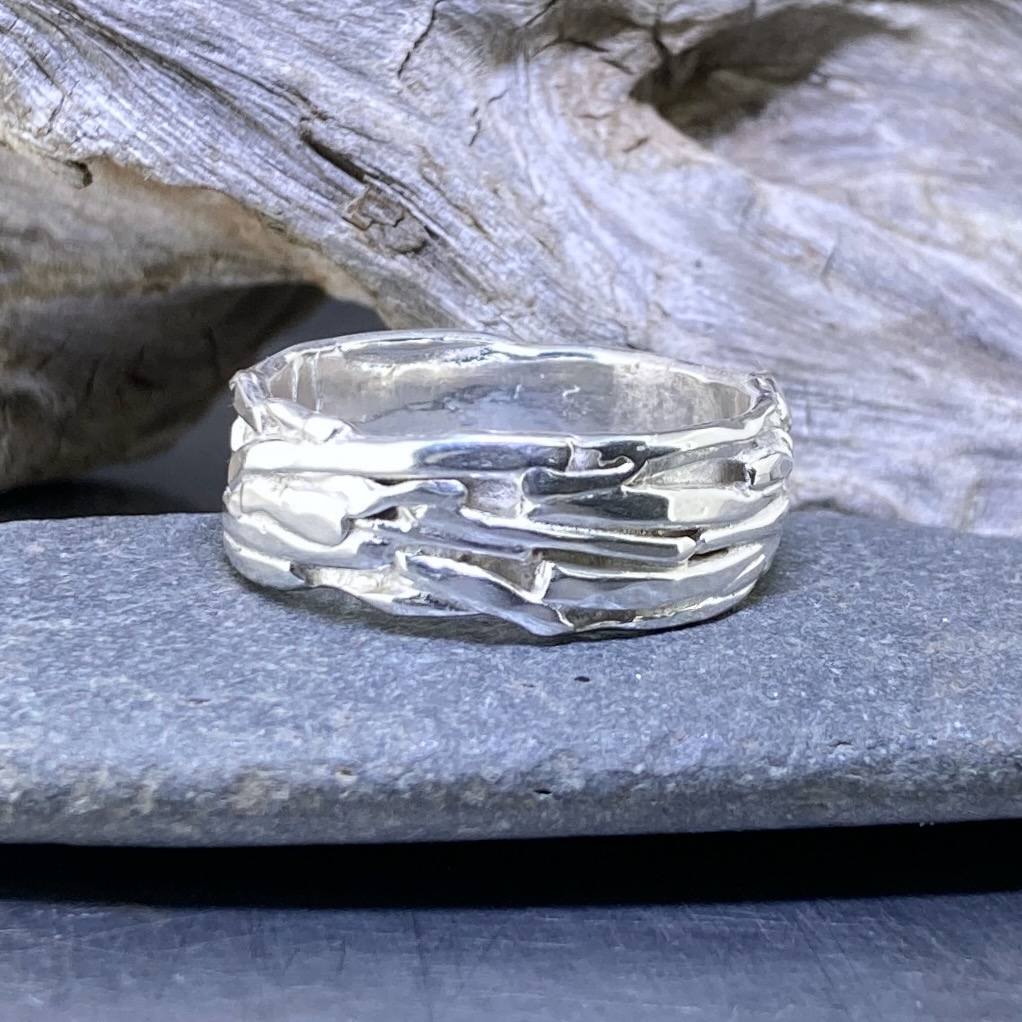 This is a solid Argentium silver band – hand made each time.  It is layers of Argentium silver laid over top of each other and fused.  More and more silver is layered until a pattern of silver Bark emerges.  Very beautiful – great for casual – great for Men and Women.