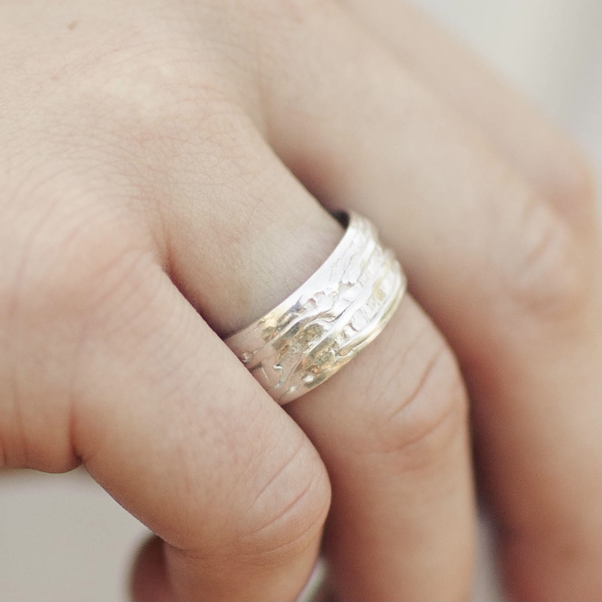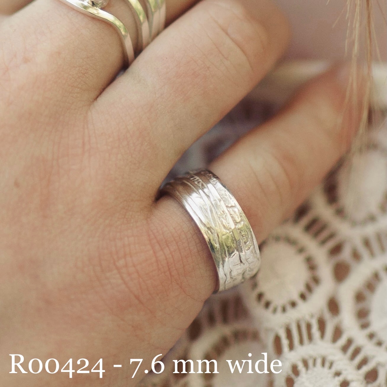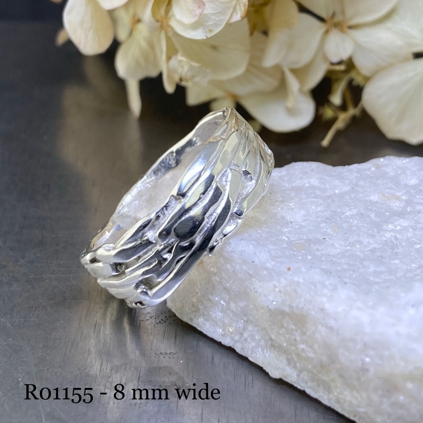 This is a solid Argentium silver band – hand made each time.  It is layers of Argentium silver laid over top of each other and fused.  More and more silver is layered until a pattern of silver Bark emerges.  Very beautiful – great for casual – great for Men and Women.