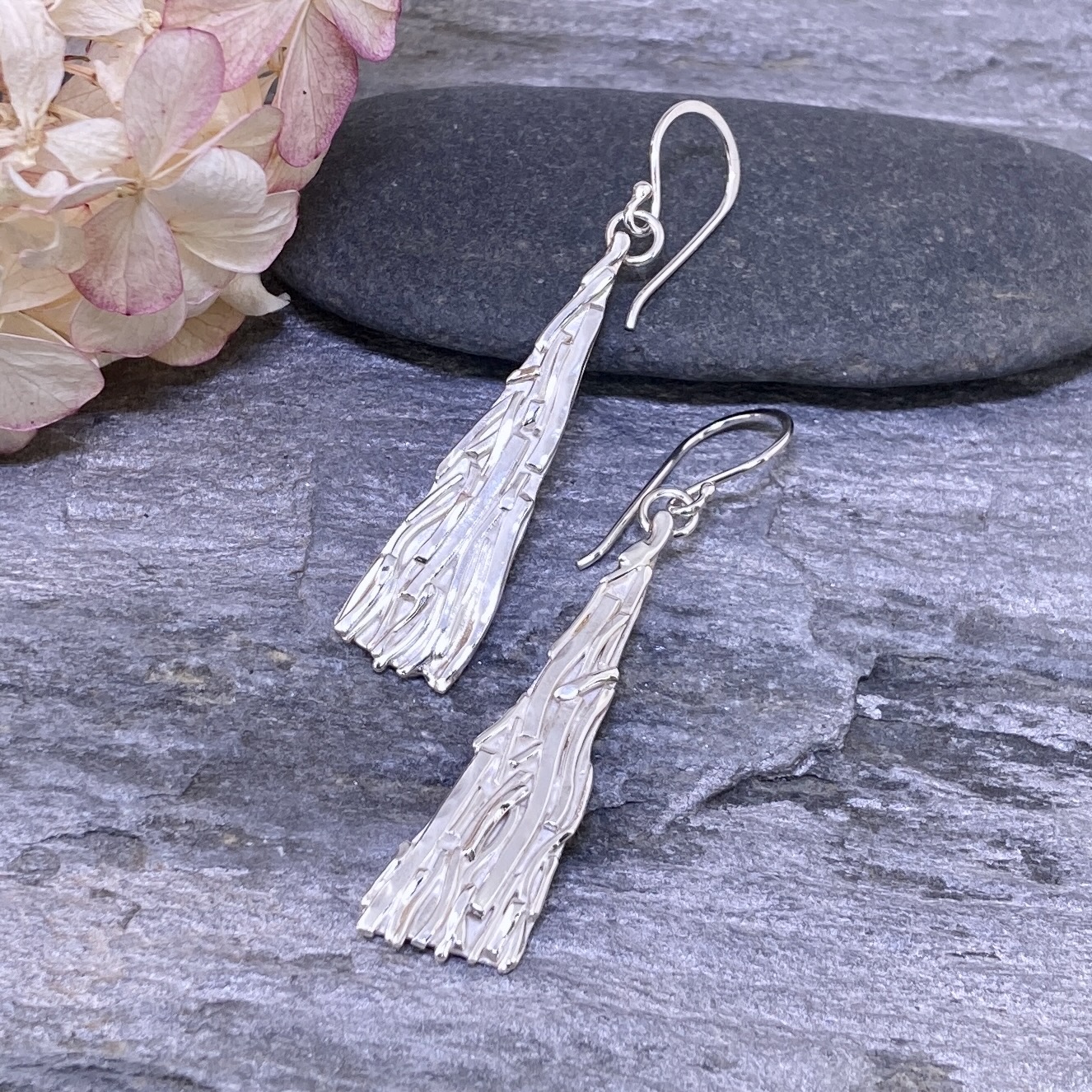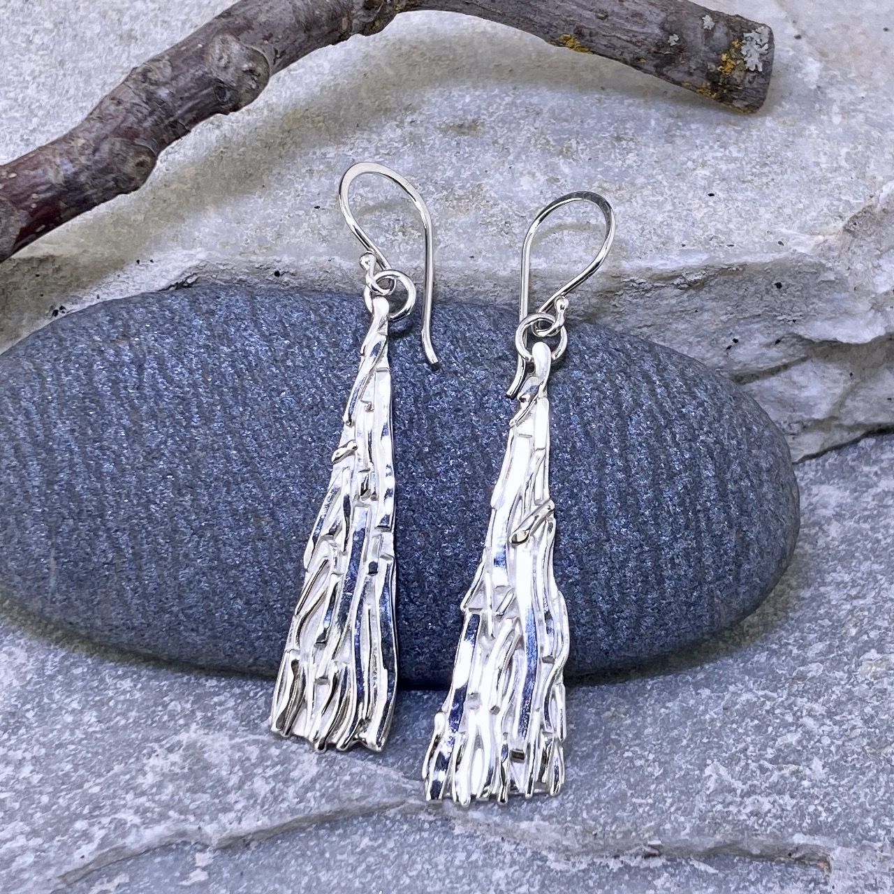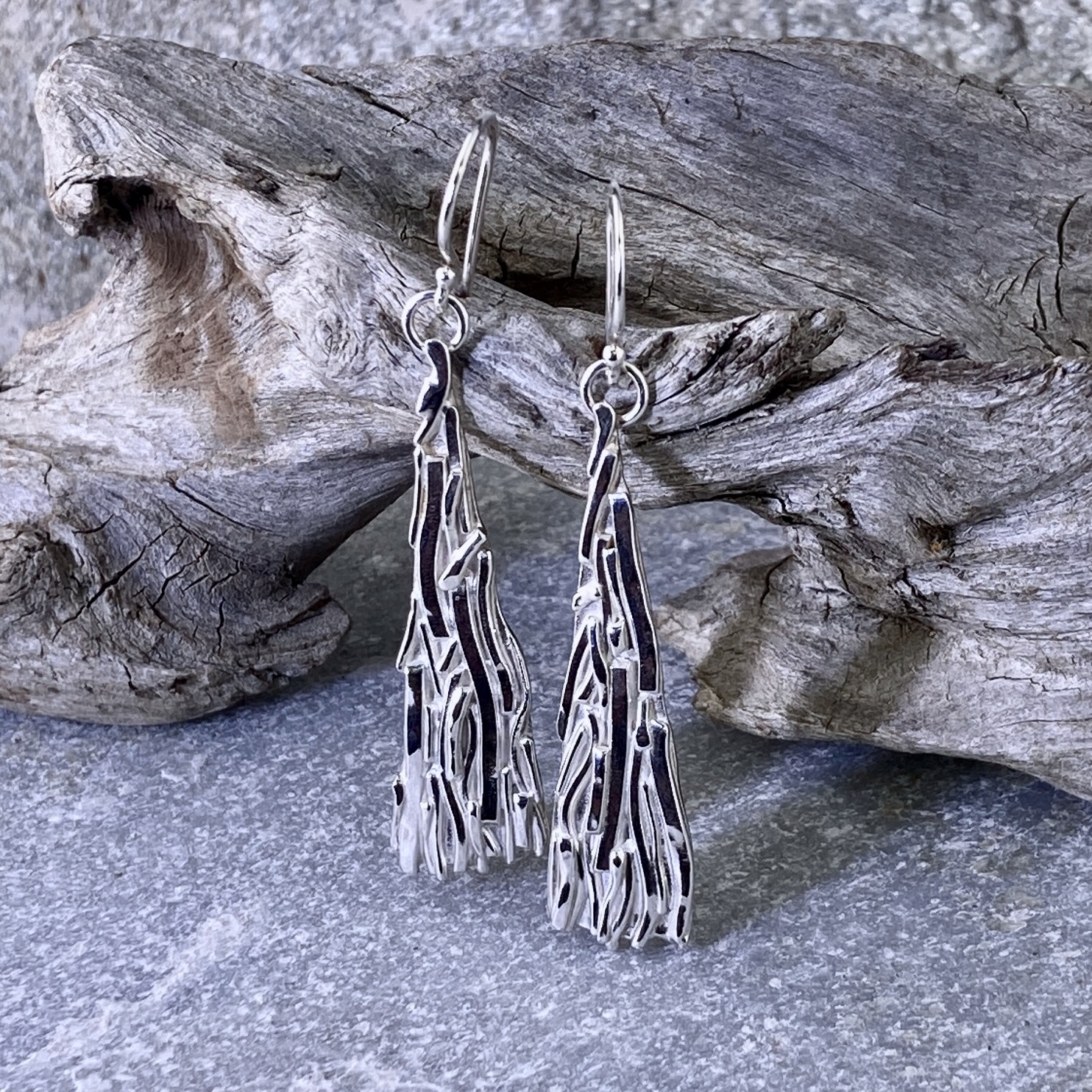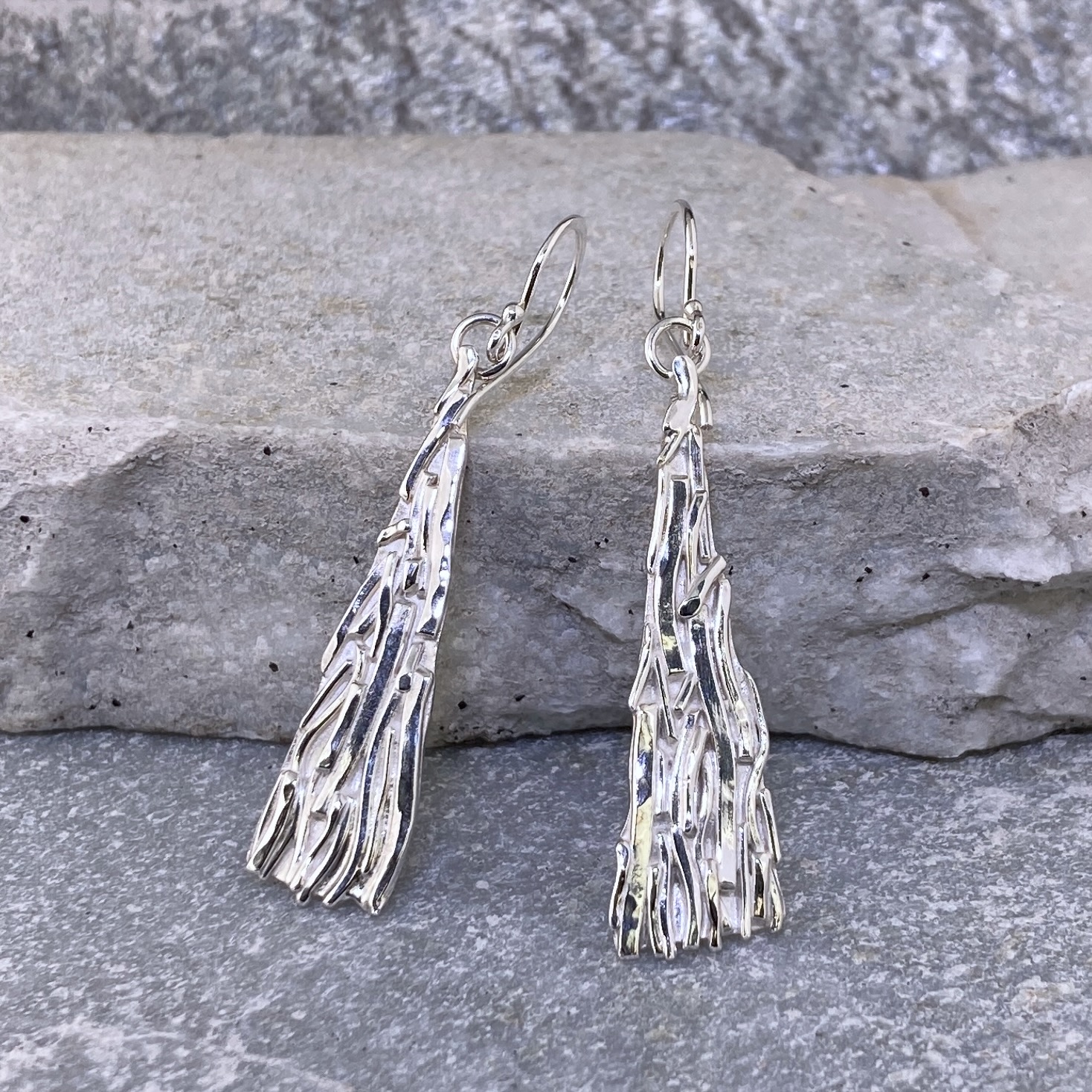 I start with a sheet of Argentium silver cut to the finished shape. Then I texture and fuse strips of silver to the surface, layering them until the pattern resembles natural bark. Each earring is shaped, refined, and polished by hand, creating a pattern that reflects the quiet rhythm of the forest.