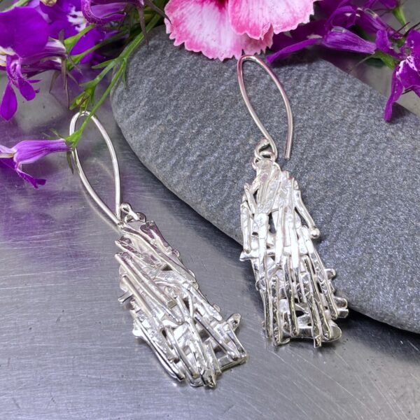 These are long, bark design earrings.  Silver pieces laid out and fused together, to look like a piece of Bark.  These are the vertical design bark earrings.
